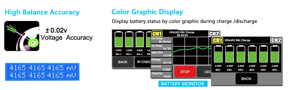 Дисплей, простота в эксплуатации, встроенный вентилятор охлаждения, DC 11 ~ 18 В или AC 100 ~ 240 В двойная мощность. Предназначен для зарядки LiPo LiFe Lilon LiHV NiCd