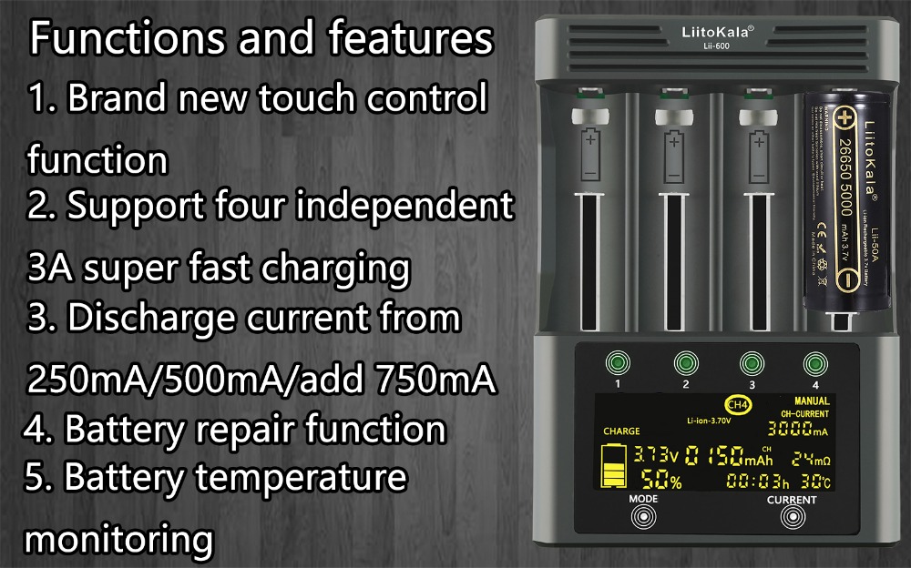 Благодарим Вас за покупку нашей компании высококачественной модели зарядного устройства Lii-500S высококачественного интеллектуального универсального ЖК-быстрого зарядного устройства с многофункциональными сенсорными кнопками/4 независимых канала зарядки/разрядки/проверки емкости/защиты от обратная защита/Защита от короткого замыкания/Защита от перезарядки/Защита от перегрева/выход USB 5 В/активация нулевого напряжения аккумулятора и так далее. Между тем он может автоматически и в реальном времени контролировать процесс зарядки, разрядки и тестирования аккумулятора.