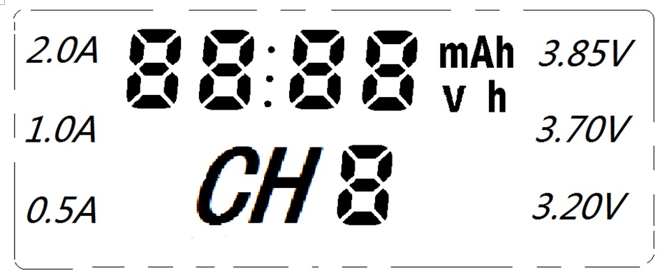 2. ЖК-дисплей: при подключенном источнике питания ЖК-дисплей будет гореть в течение 3 секунд: 1) Если батарея не вставлена, ЖК-дисплей отобразит «ноль» и выключится через 30 секунд 2) когда батарея вставлена и обнаружена, на ЖК-дисплее отображается номер канала, а изображение типа батареи" Li-Ion 3,7 В "мигает, указывая на Тип батареи: в этот момент, если короткое нажатие кнопки канала, можно установить тип батареи; если в течение 5 секунд не работает, он начинается с автоматического обнаружения (Li-Ion 3,7 В или NIMH), тогда изображение процента зарядки будет мигать, что означает начало зарядки. В то же время ЖК-дисплей отображает также напряжение заряда, емкость, время и ток. Когда зарядка завершится, отобразится «100%», в то время как в правом нижнем углу ЖК-дисплея отображается «Конец».
