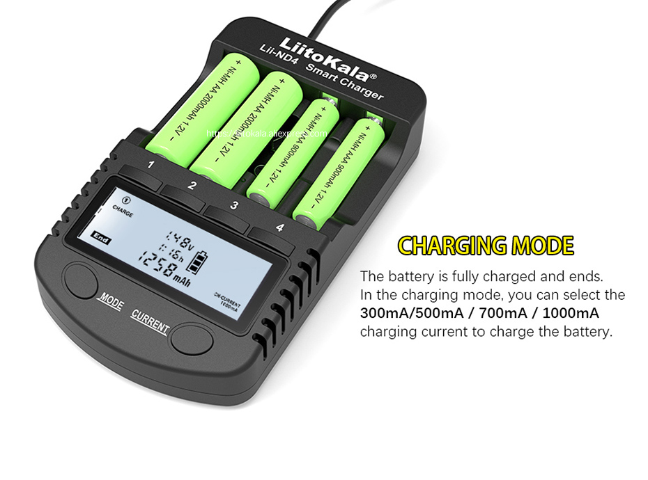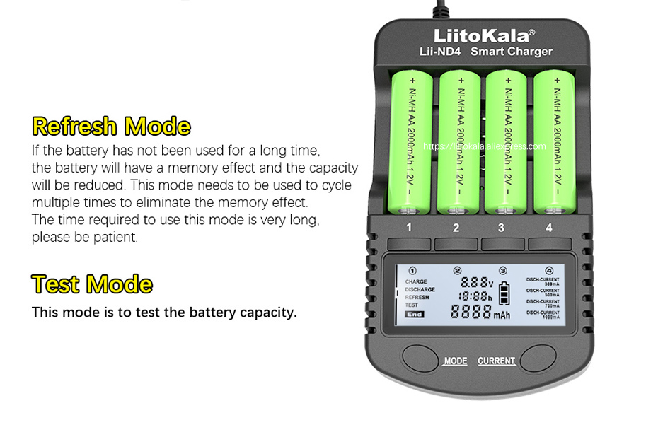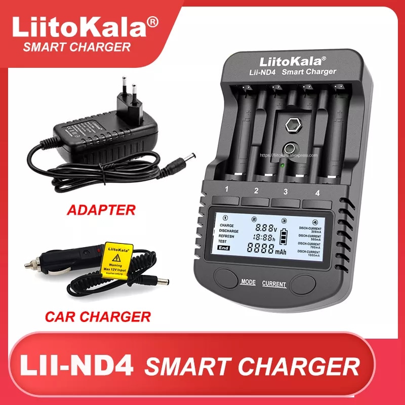 Бренд: LiitoKala Модель: Lii-ND4 Вход: DC 12V/1. Выход 5A: 1,48 В постоянного тока (300 мА/500 мА/700 мА/1000 мА) / 9 В (30 мА) выход USB: 5 В/1 а подходящие Аккумуляторы: NiMH/Cd AA, AAA, 9V, батарея.