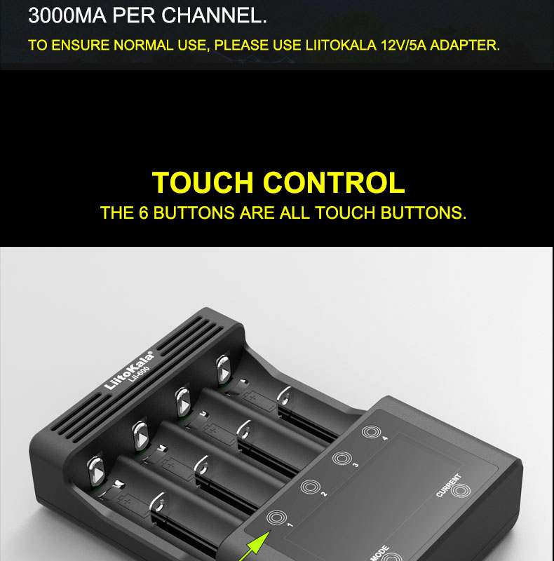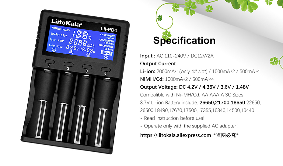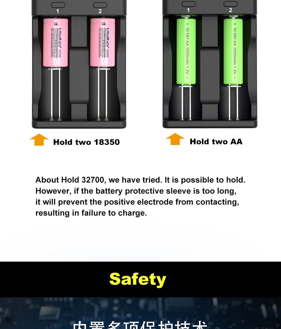 Li-ion / IMR/LiFePO4: 26650,21700,20700, 18650, 18490, 18350, 17670, 17500, 16340(RCR123), 14500, 10440