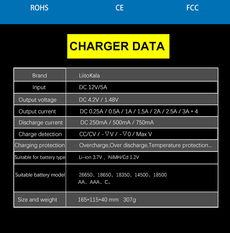 Литий-ионный 3,70 В/литий-ионный 3,85 В (IMR); зарядный ток двух резервуаров всего не превышает 2 А, то есть когда один из резервуаров заряжен током 2 А, А затем аккумулятор заряжается в другом баке, передний ток 2А снизится до тока 1А; ЖК-дисплей будет отображать ПОЛНЫЙ, когда батарея полностью заряжена;