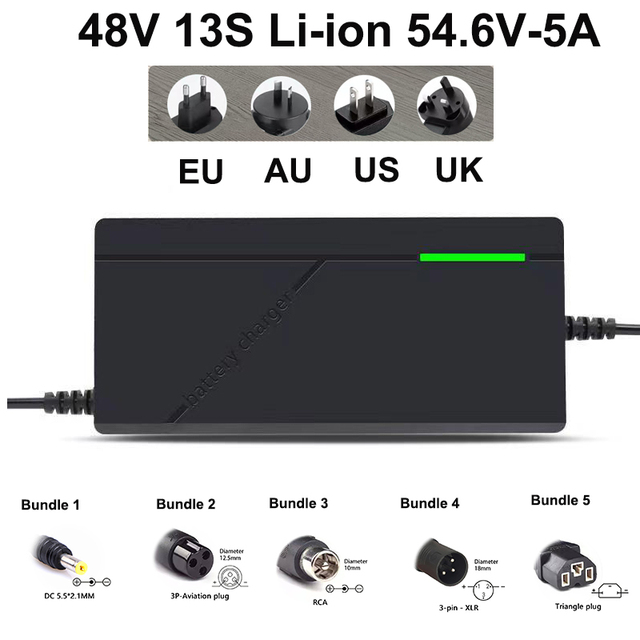 48V 52V 2A-3A-5A charger 13S 14S lithium battery 54.6V 58.8V intelligent fast charging DC/Aviation/RCA/XLR/Triangular output plug EU/US/AU/UK input plug 100~240V AC, 50/60Hz