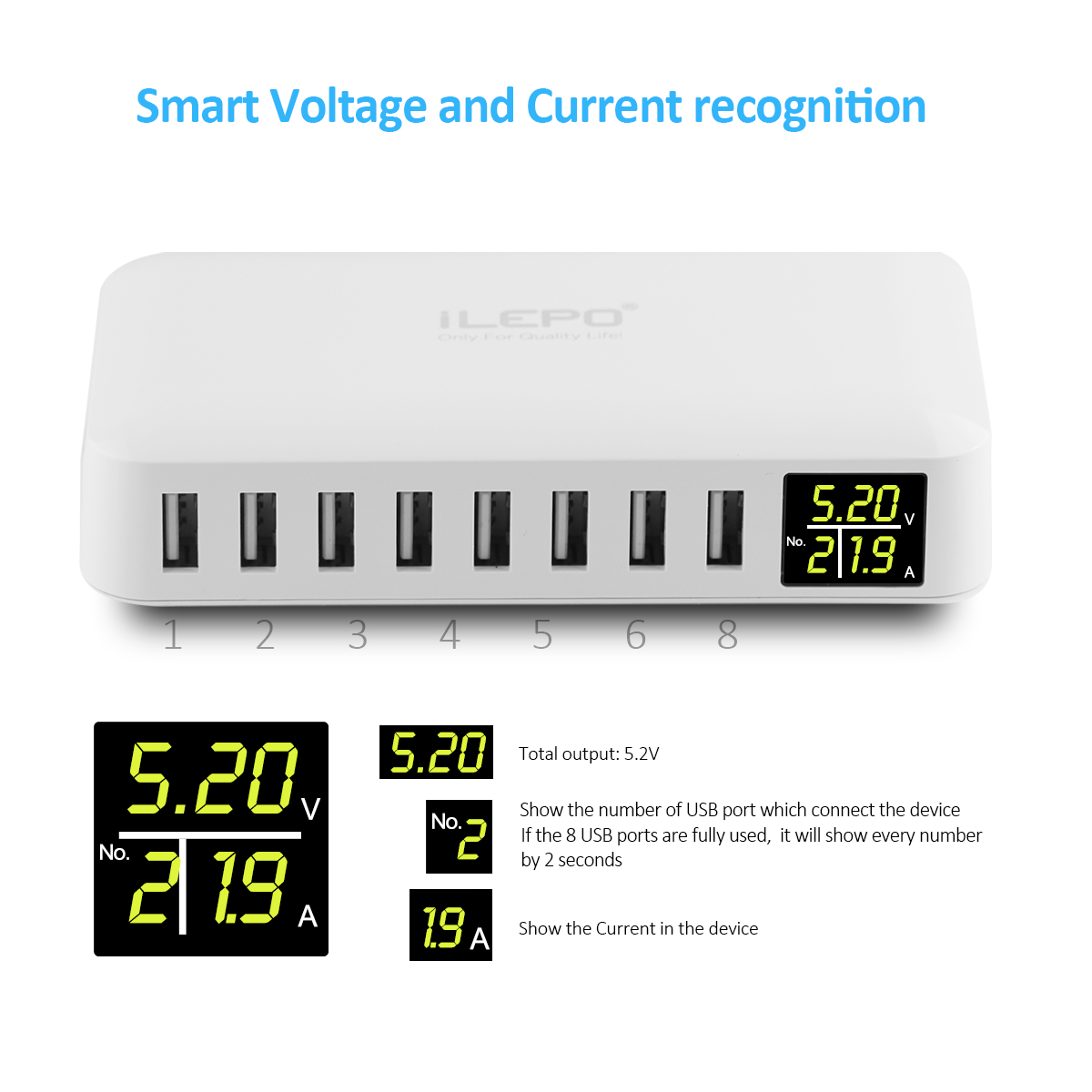 С внешней стороны 8-Порты и разъёмы USB зарядная станция являются огнеупорными, и поставляется с гладким яркий белый отделка.