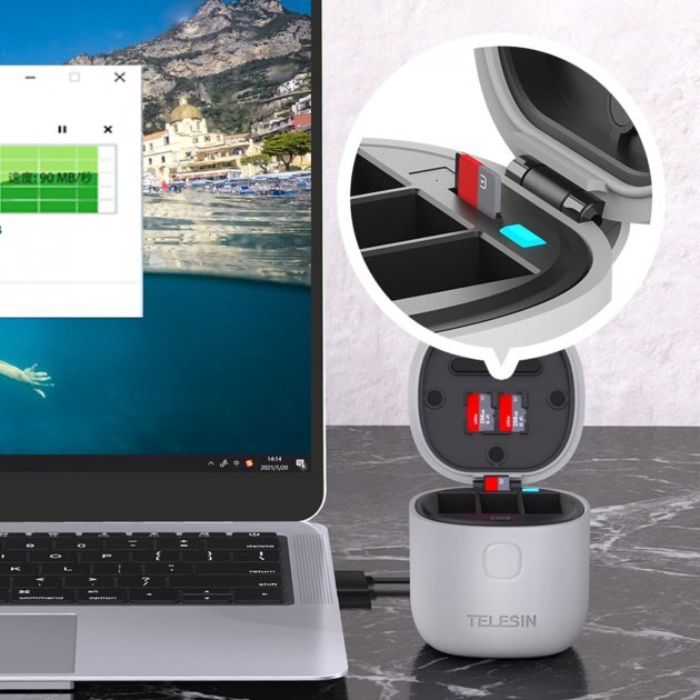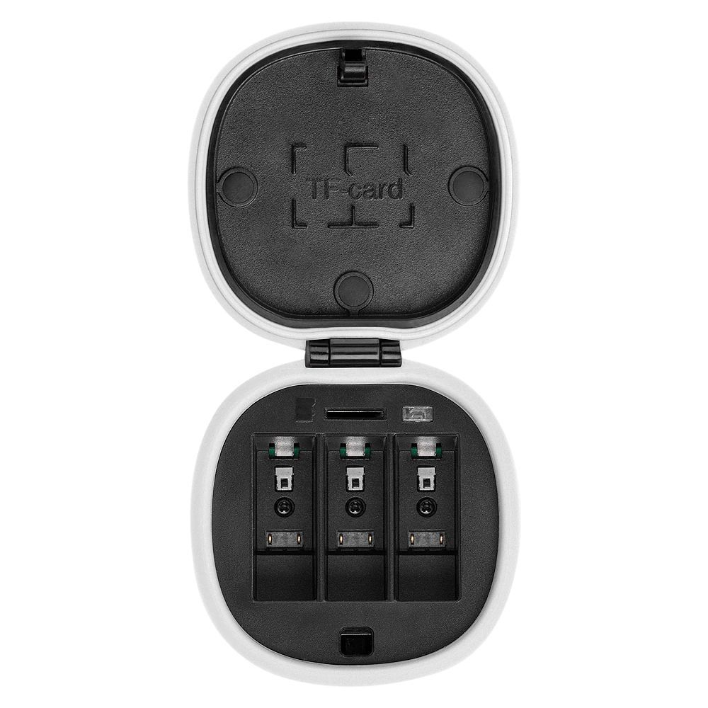 Описание: Зарядное устройство 3-в-1 с функцией зарядки, хранения и чтения карт TF. Данное устройство может заряжать до 3-х аккумуляторов одновременно, а так же хранить в себе 3 аккумуляторные батареи GoPro 5/6/7/8 и 3 карты TF одновременно, также может использоваться в качестве картридера, подключив его напрямую к компьютеру через usb-кабель.