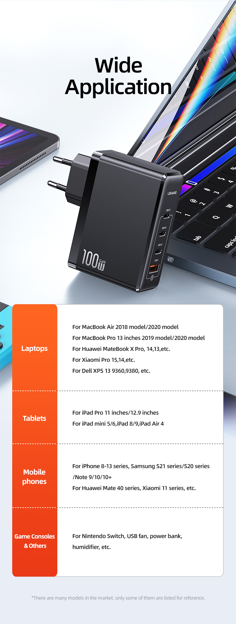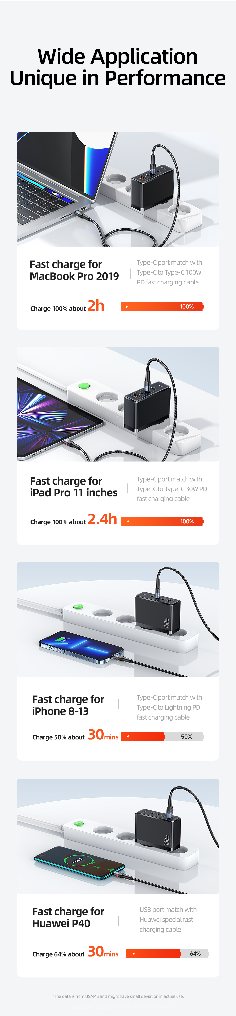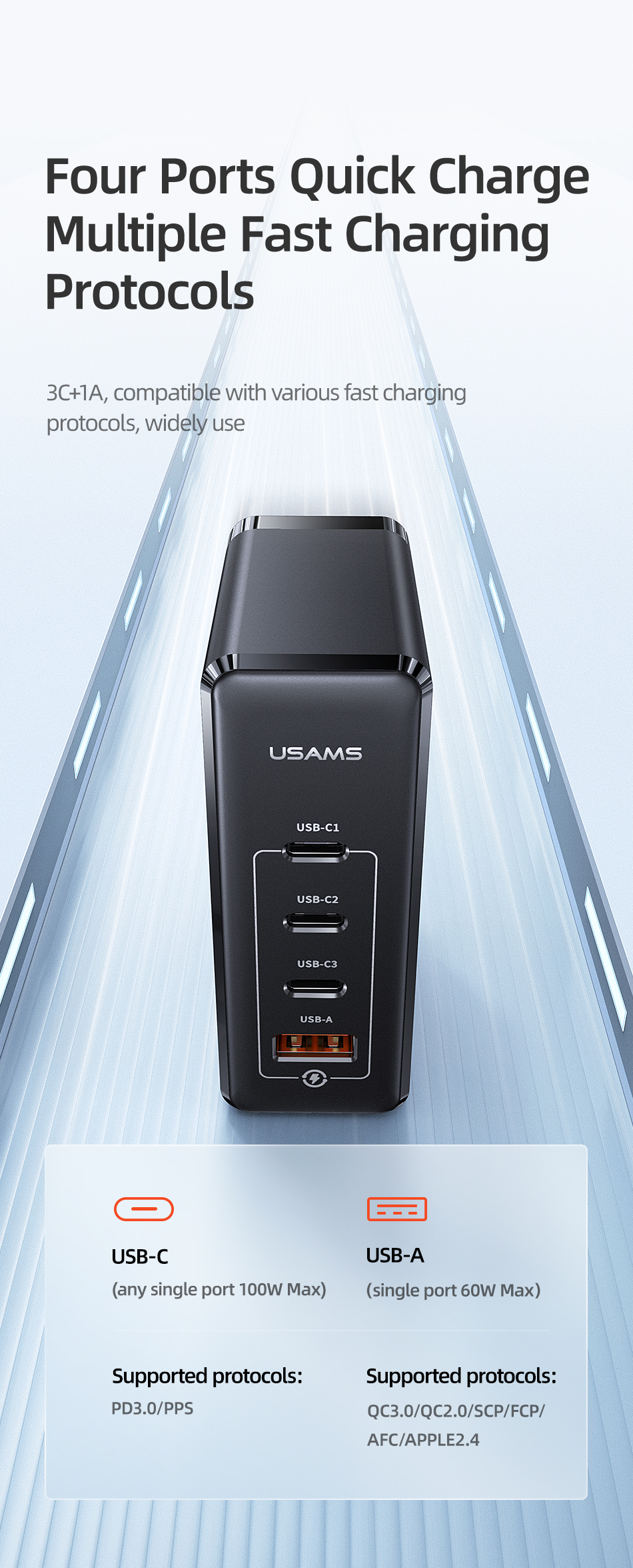 Зарядное устройство USAMS 100 Вт с 4 USB-портами и поддержкой быстрой зарядки