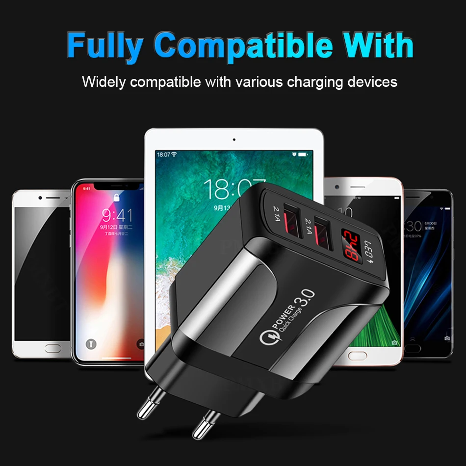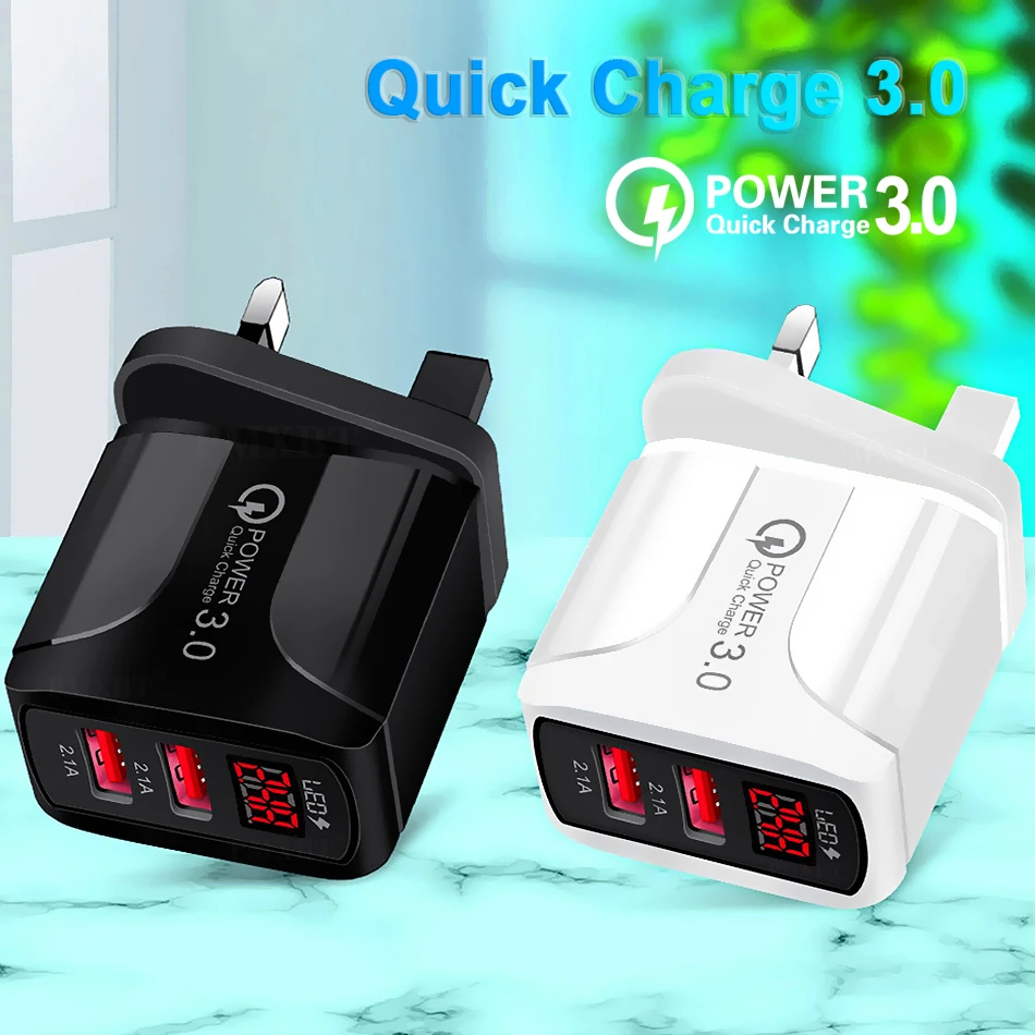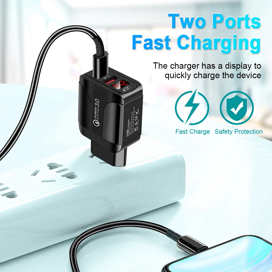 Зарядное устройство USB 3,0 А, быстрая зарядка, адаптер в стене со светодиодным дисплеем, быстрая зарядка 2,0, дорожное зарядное устройство с двумя USB-портами для планшета