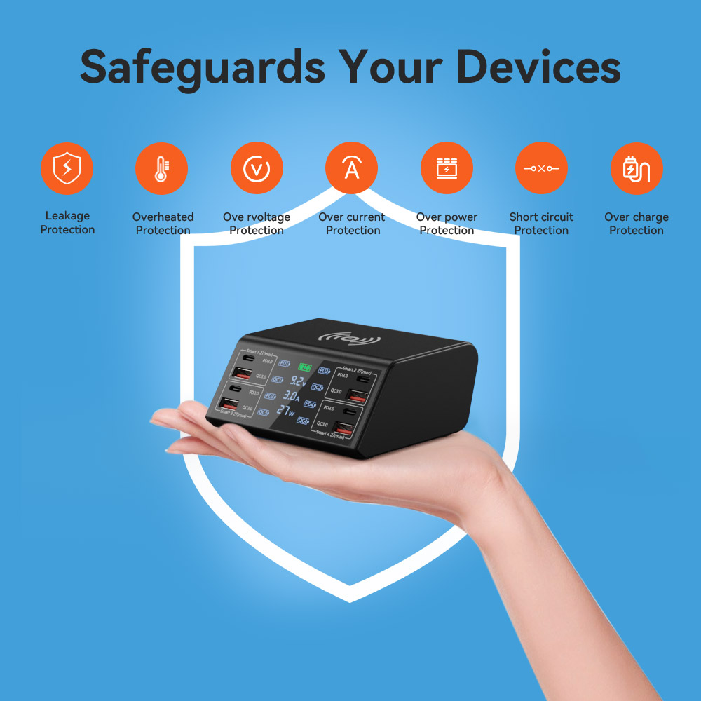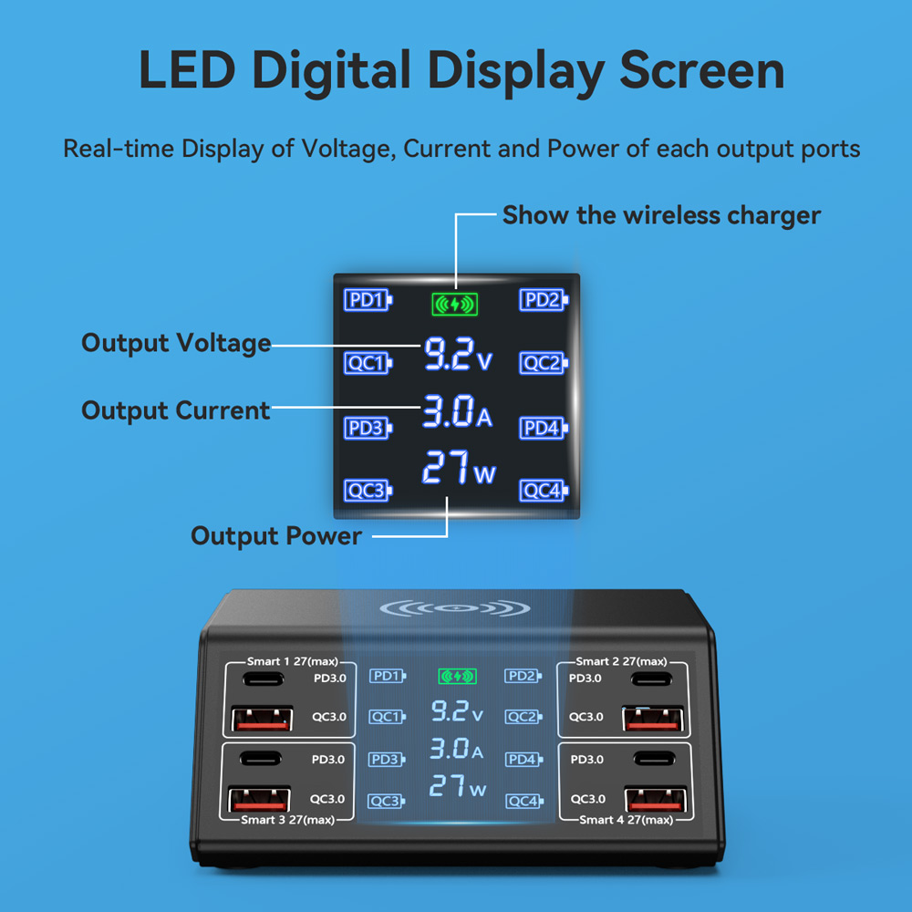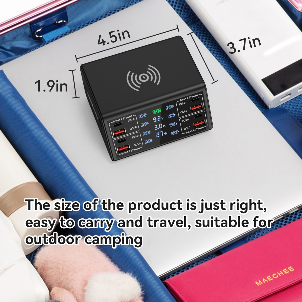 С беспроводной зарядкой QI и 4 портами USB A для быстрой зарядки и 4 портами USB C PD, светодиодным ЖК-дисплеем и переключателем экрана