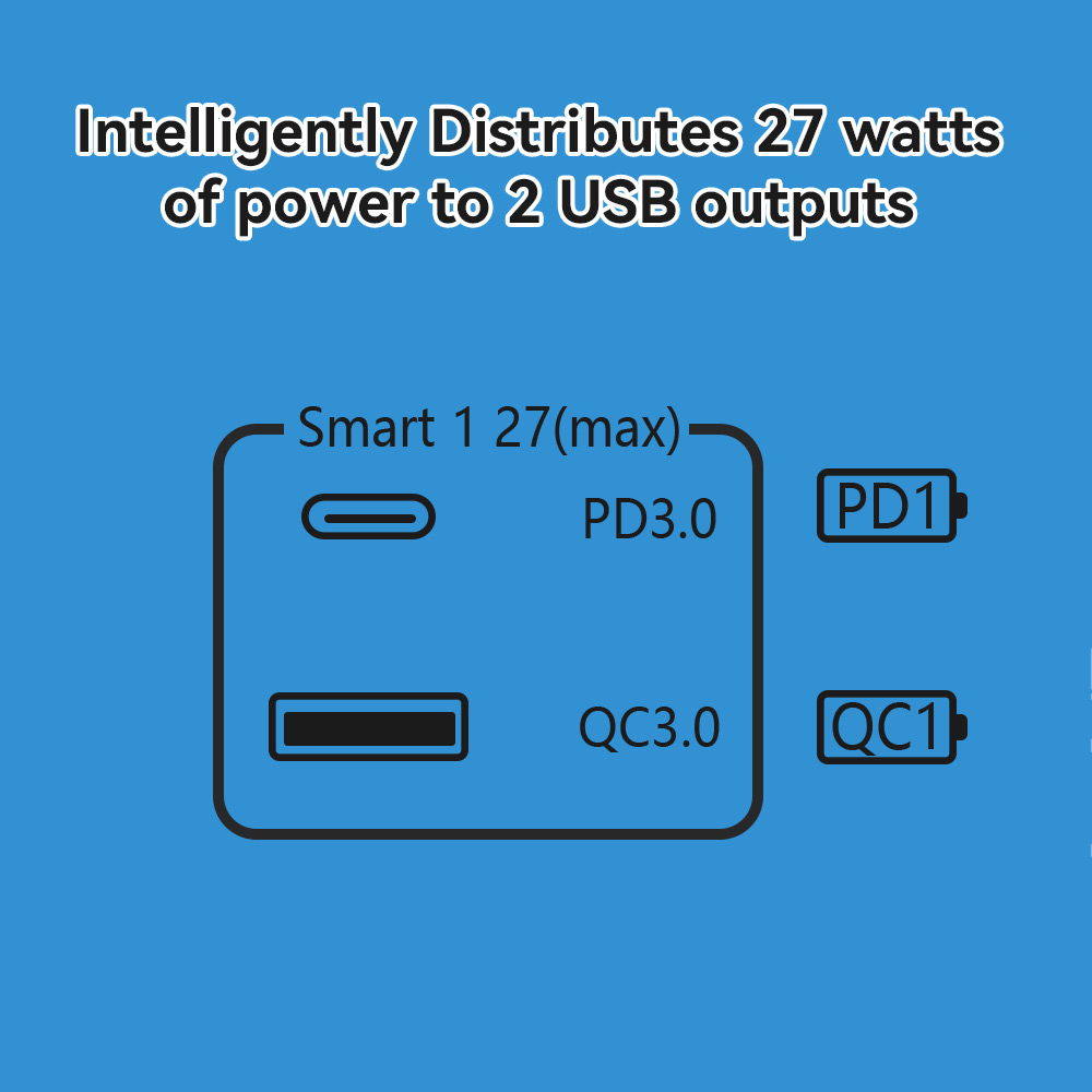 Smart 27 Вт: интеллектуально распределяет 27 Вт мощности на 2 выхода USB (IQ 27 Вт)