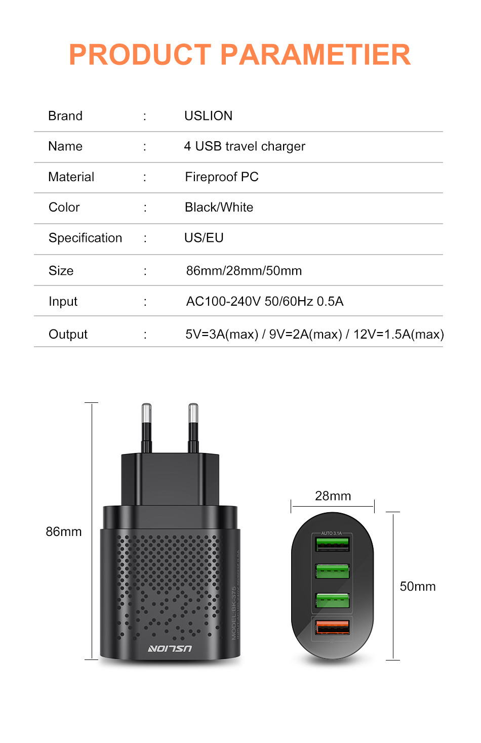 Зарядное устройство USLION, 4 порта, 45 Вт