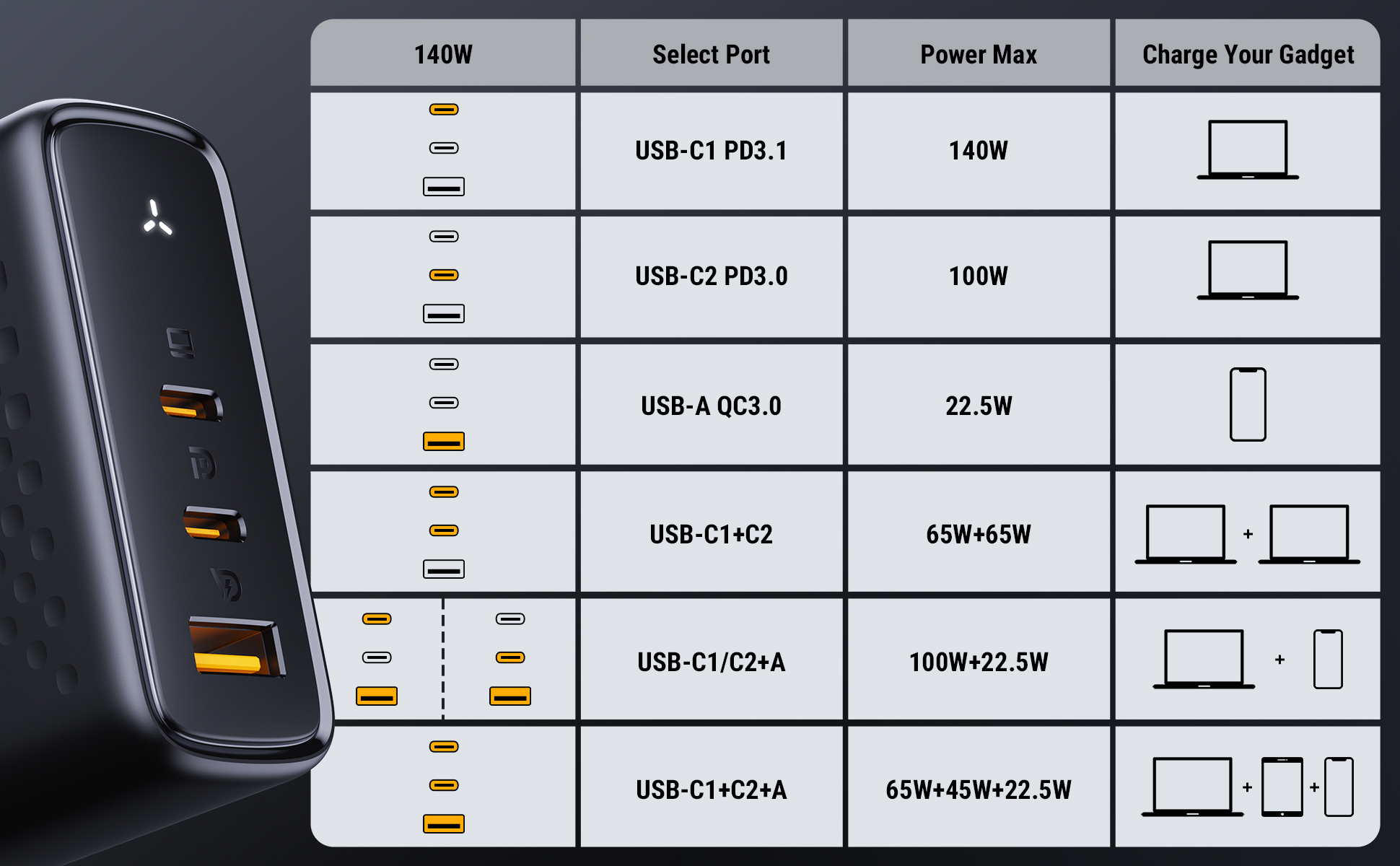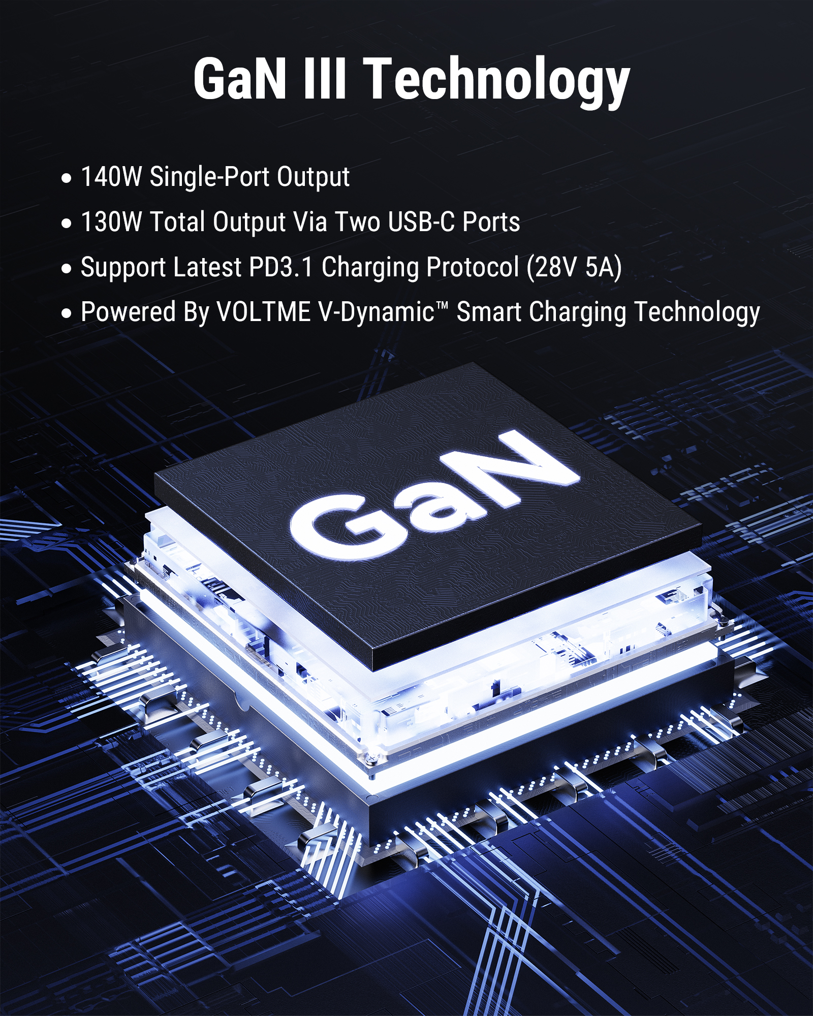 Новейший в отрасли чип GaN Ⅲ встроен в зарядное устройство USB-C мощностью 140 Вт. V-Dynamic двухканальный источник быстрого питания. Обеспечивая лучшую производительность зарядки, передовая технология GaN также позволяет зарядному блоку иметь лучшие характеристики рассеивания тепла. Этот адаптер питания USB C может обеспечивать плотность мощности до 0,9 Вт при более низкой рабочей температуре, чем другие зарядные устройства GaN.