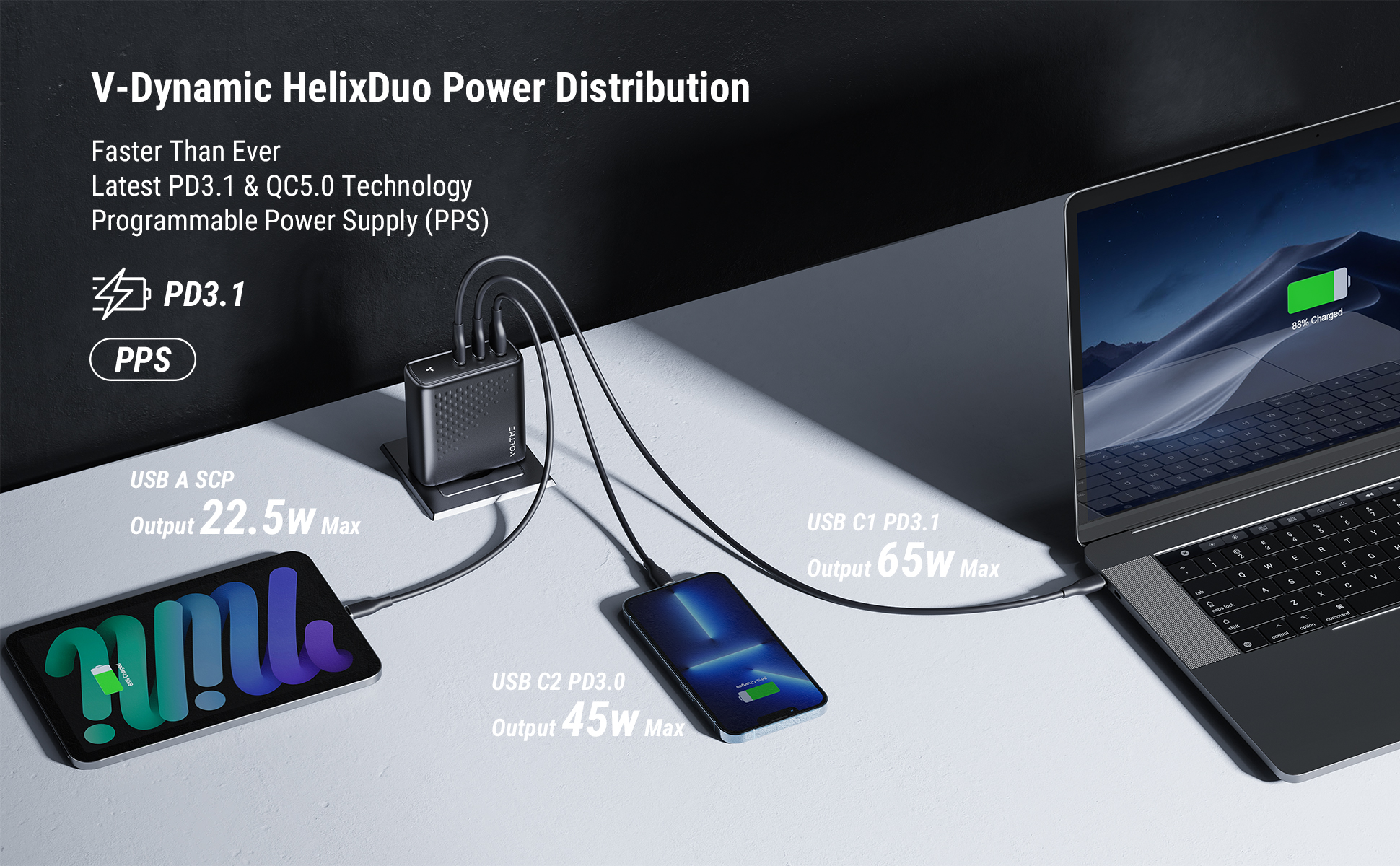 Зарядное устройство VOLTME V-Dynamic 140W USB-C имеет 2 порта и порт USB-C. Заряжайте два ноутбука и телефон одновременно на полной скорости, чтобы удовлетворить потребности офиса для двух человек, с помощью этого адаптера питания Macbook.