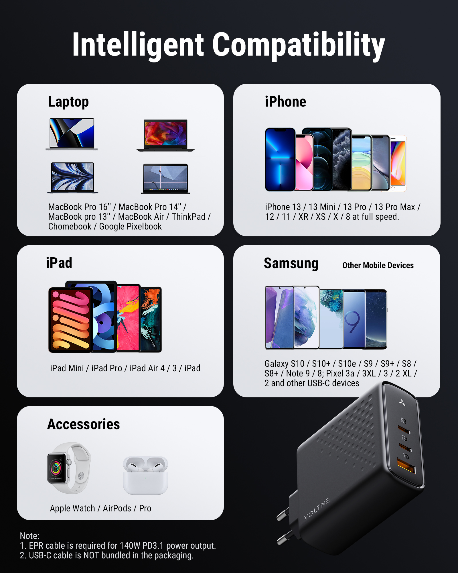 Зарядное устройство VOLTME V-Dynamic 140 Вт GaN обеспечивает быструю зарядку практически всех телефонов, планшетов, ноутбуков и т. Д., В том числе MacBook Pro, MacBook Air, и 15-дюймовые/13-дюймовые Dell XPS, HP Spectre, iPad Pro/Air, Surface Pro, серии iPhone, серии Galaxy, AirPods, Switch.Оптимизирован для путешествий офиса дома