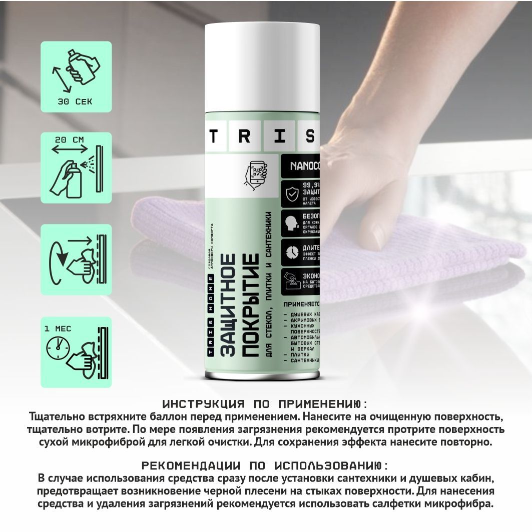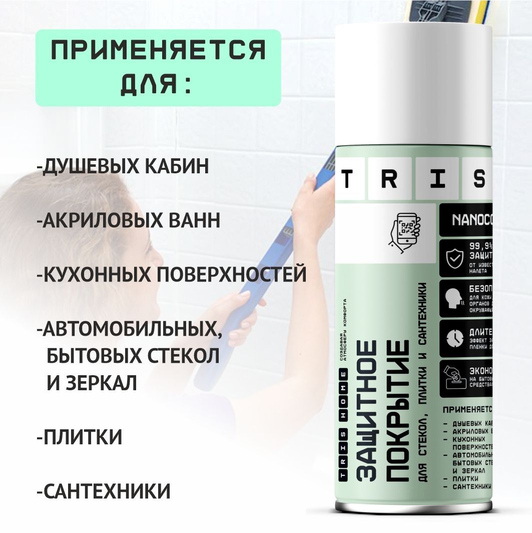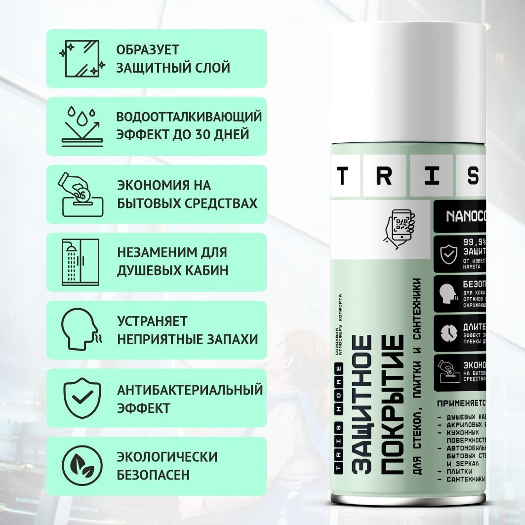 ПРЕИМУЩЕСТВА защитного покрытия  TRIS: Покрывает поверхность нанопленкой образующей защитный слой; обеспечивает водоотталкивающий эффект до 30 дней; отлично подходит для пользователей душевых кабин; обеспечивает экономию на бытовых средствах; подходит для обработки вертикальных поверхностей; безопасен для кожи, органов дыхания и окружающей среды; устраняет неприятные запахи; антибактериальный эффект поверхности: защищает от грибков, сапрофитов бактерий и вирусов на 99,9%.
