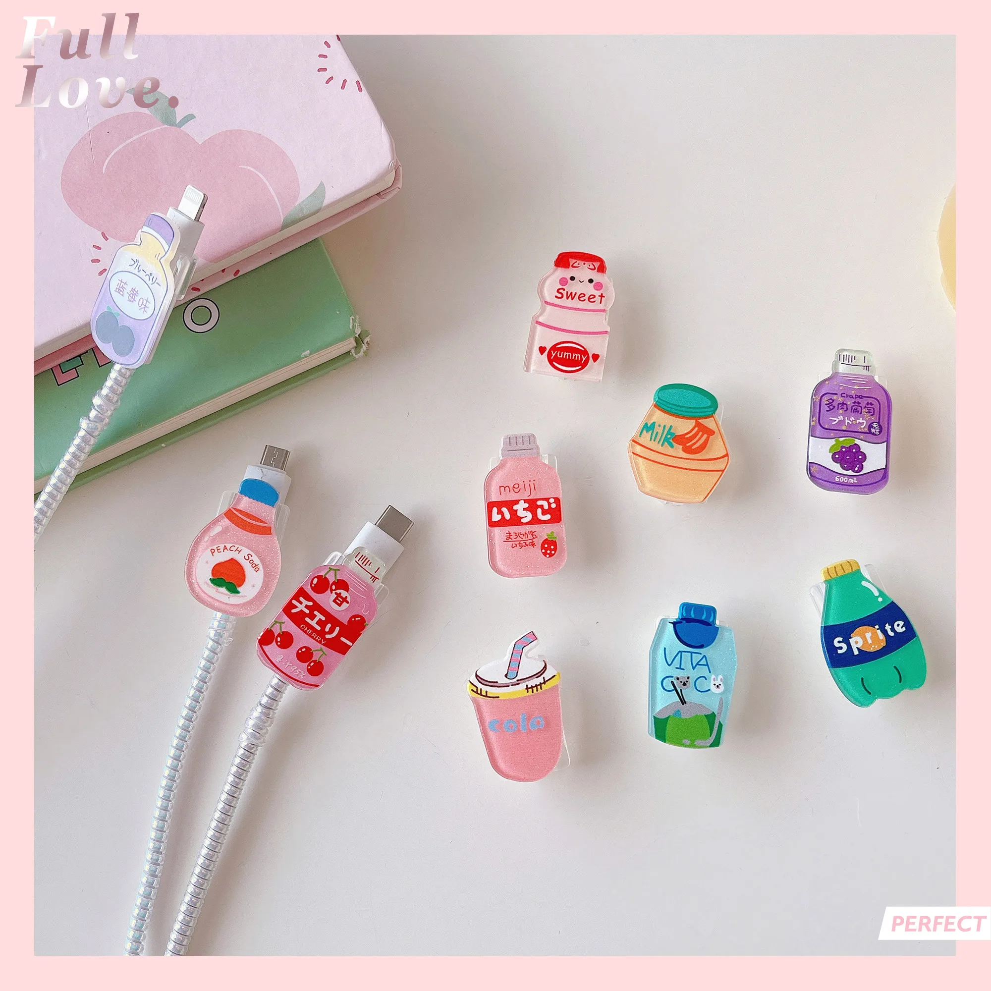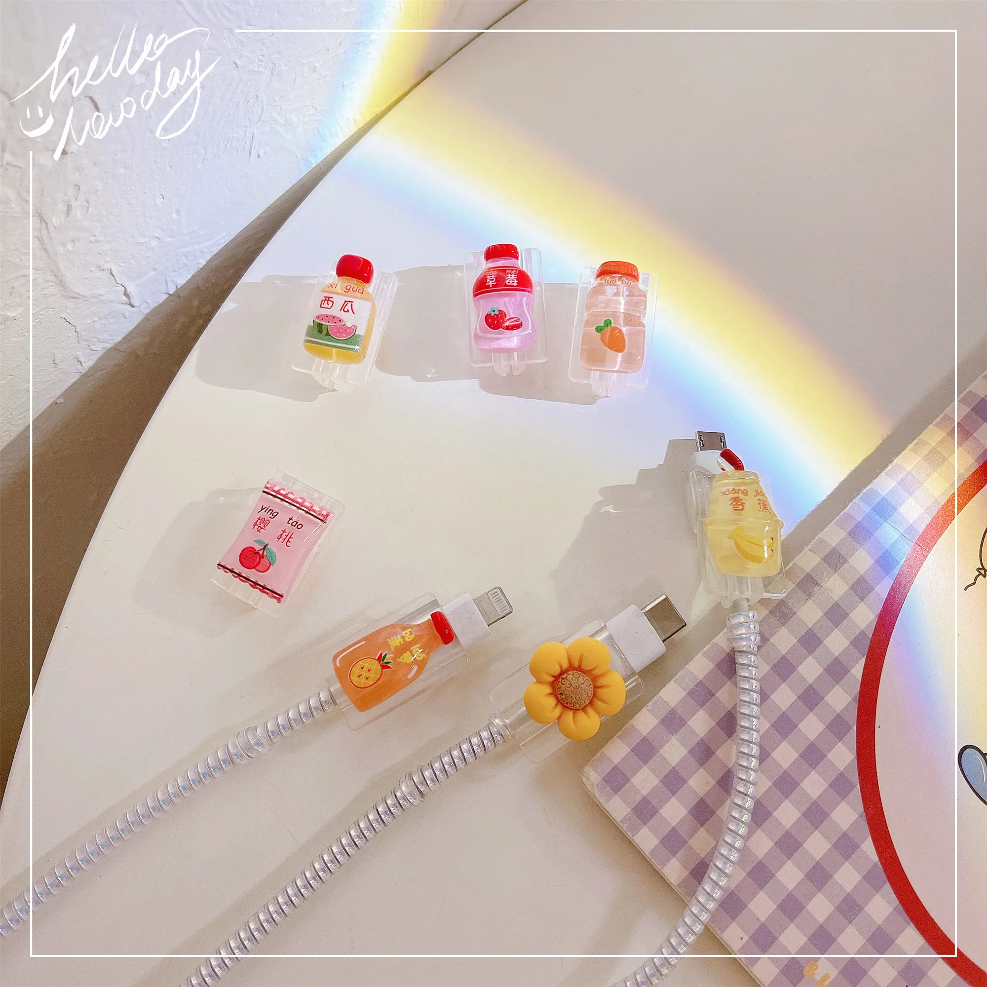 Fruit Design Usb Cable Bite Protector Cartoon Drinks Soft Tpu Data Line Decorative Cover for Iphone Android Type-C Charging Wire