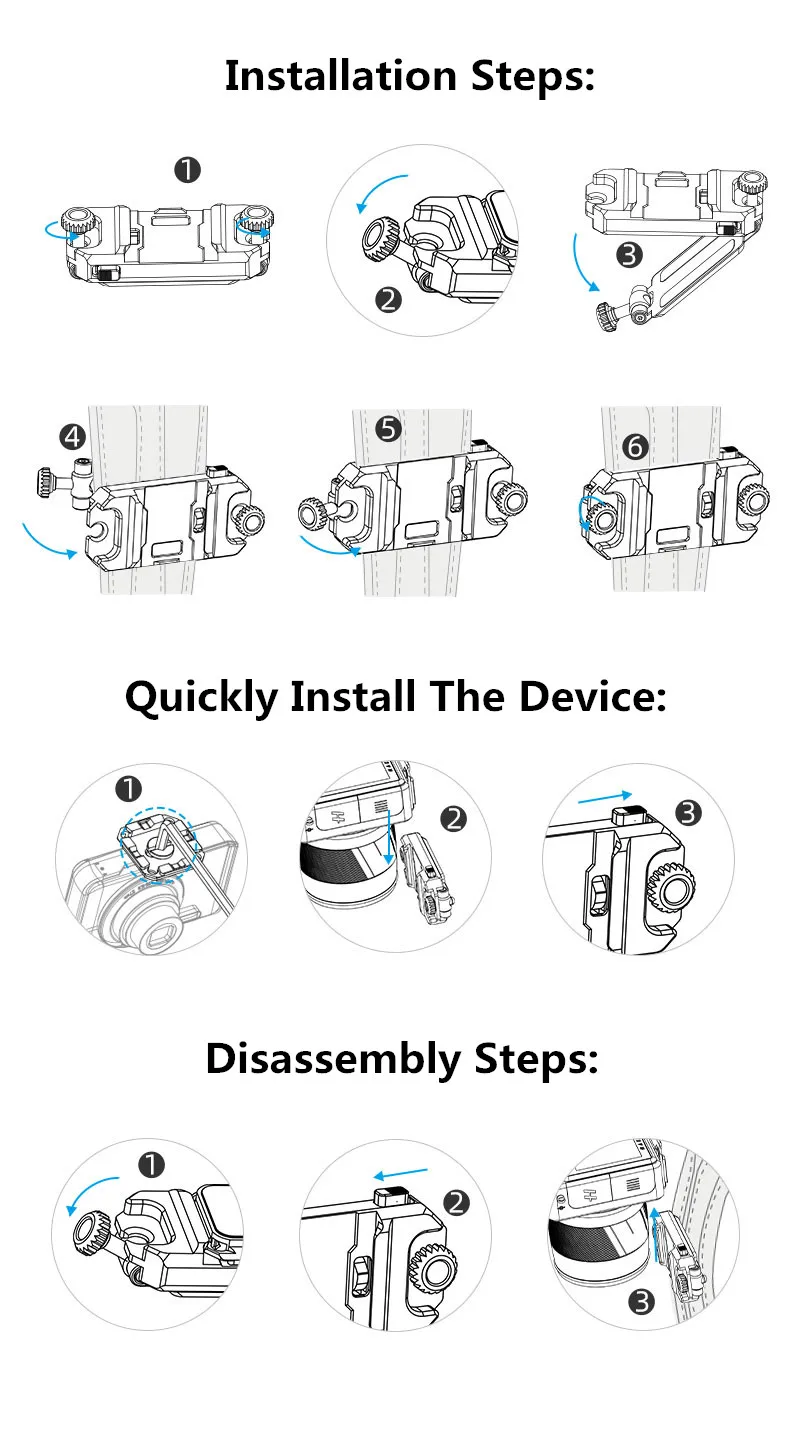 11. Быстросъемная конструкция, простая установка или снятие для большинства моделей камер на рынке, таких как экшн-спортивные камеры GoPro Hero полной серии, Цифровые зеркальные фотокамеры и микро-одиночные камеры.