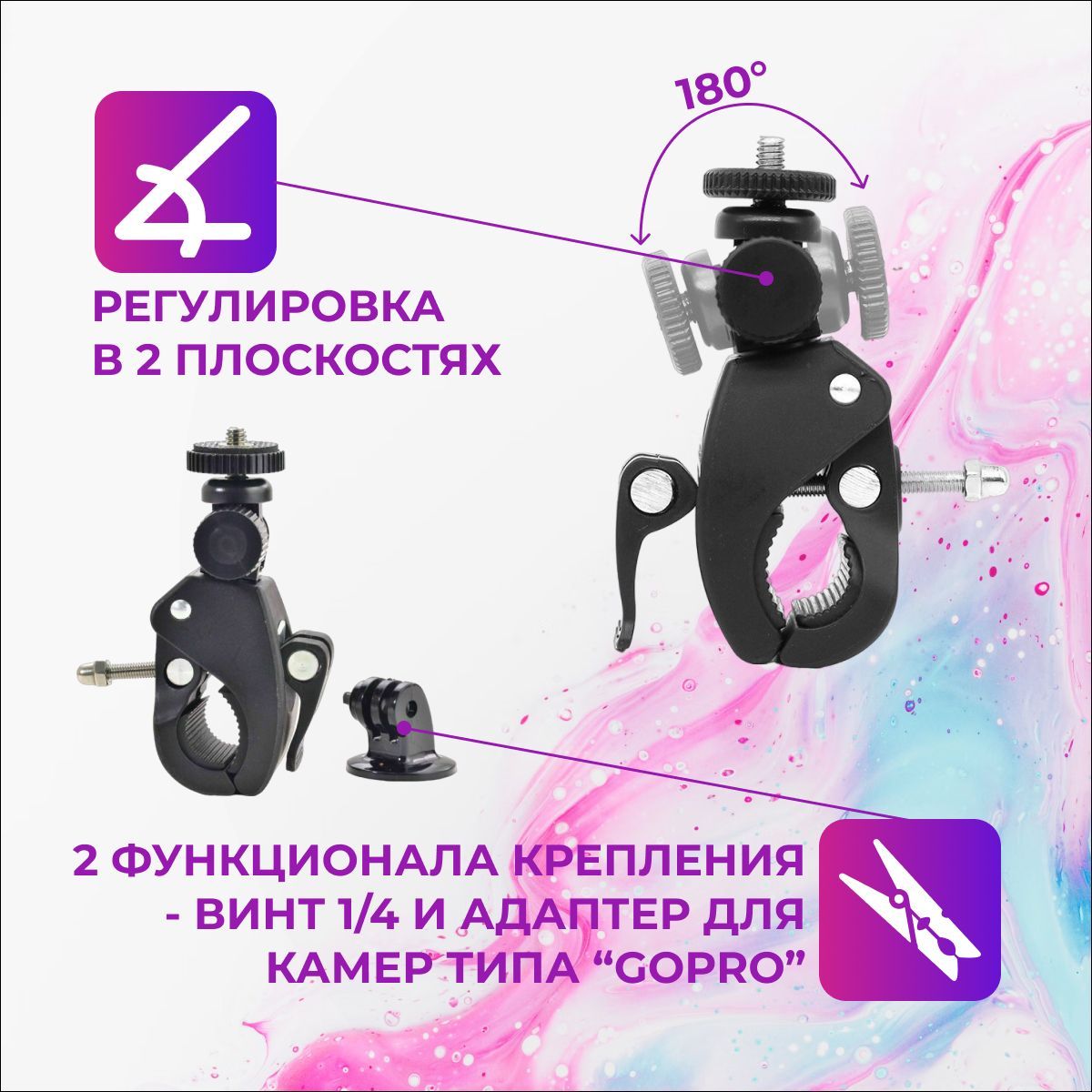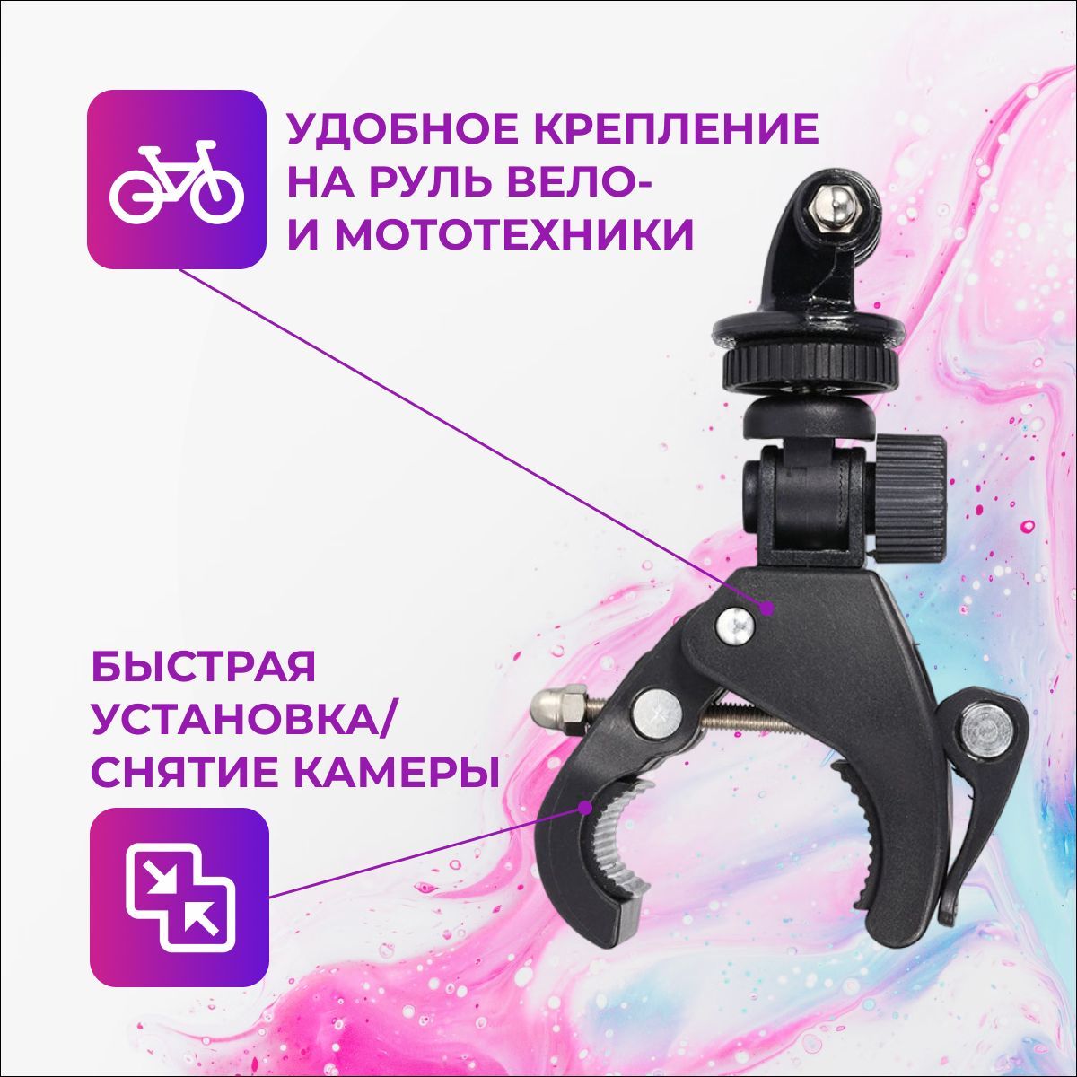 Описание: Удобное крепление с помощью ручки-зажима позволит быстро установить/снять камеру на руль вело и мото техники. Резиновые вставки уменьшают вероятность прокручивания. А регулировка в двух плоскостях позволит подобрать лучший ракурс для самых крутых кадров!