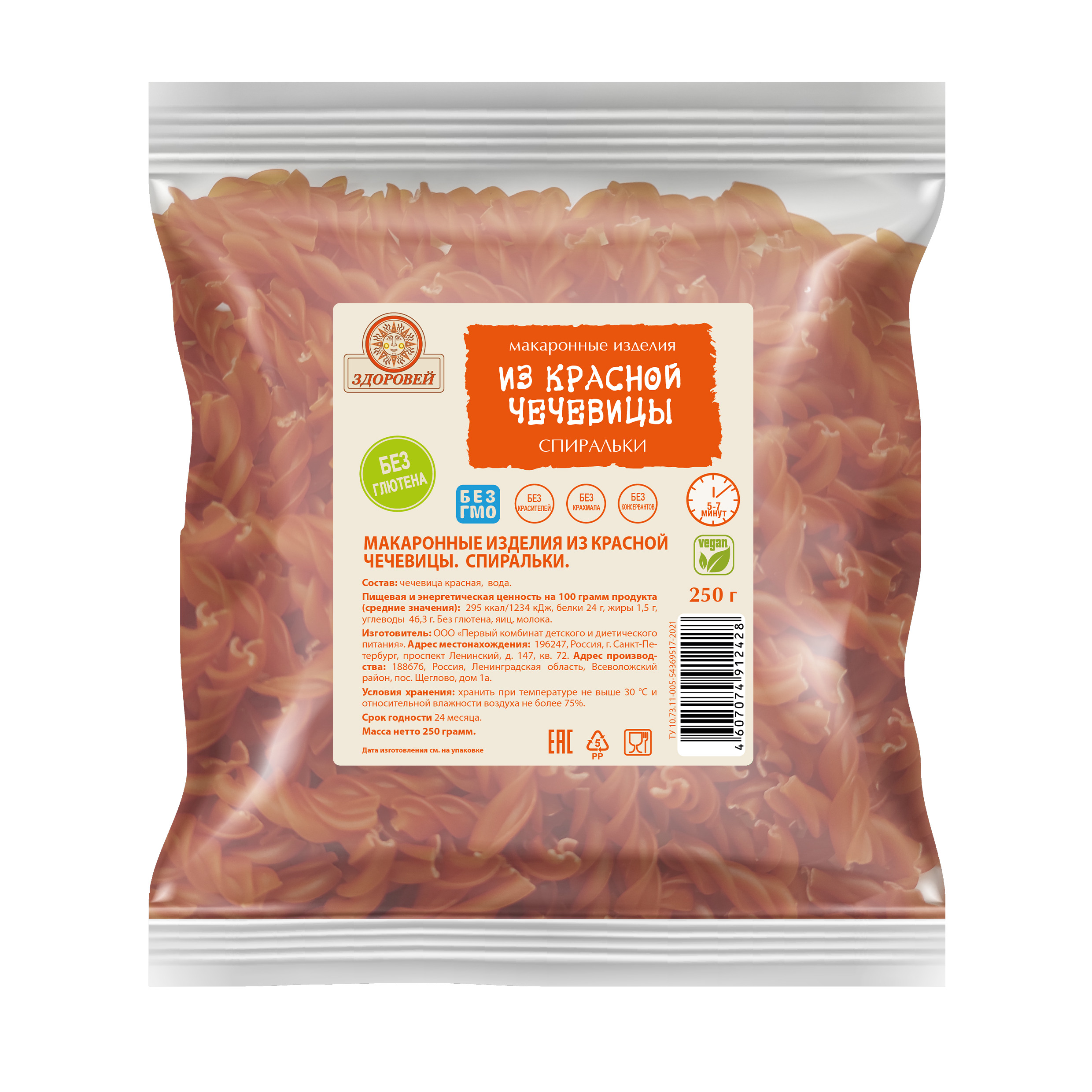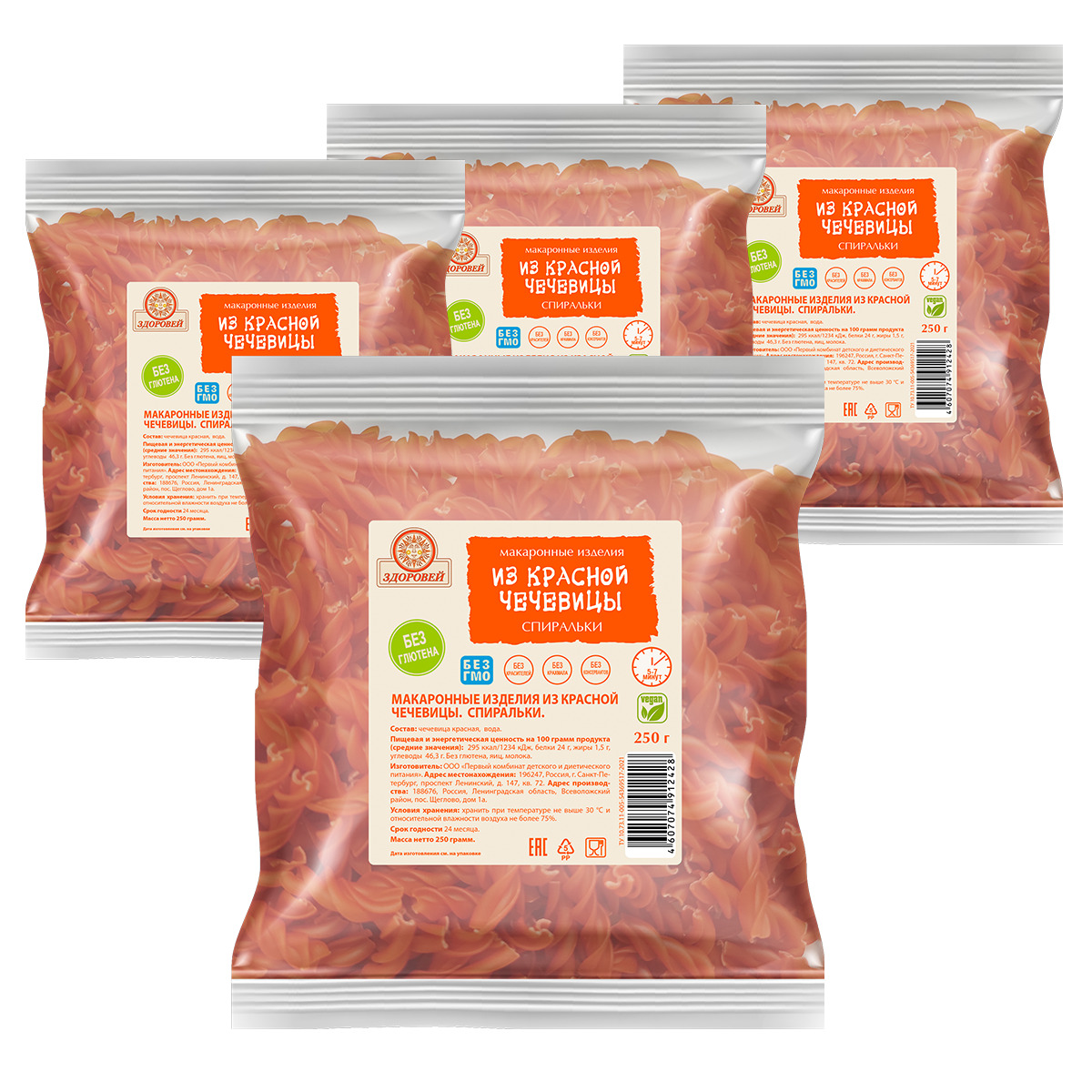 ЗДОРОВЕЙ Макаронные изделия из красной чечевицы СПИРАЛЬКИ, без глютена, 4 шт. по 250 гр.