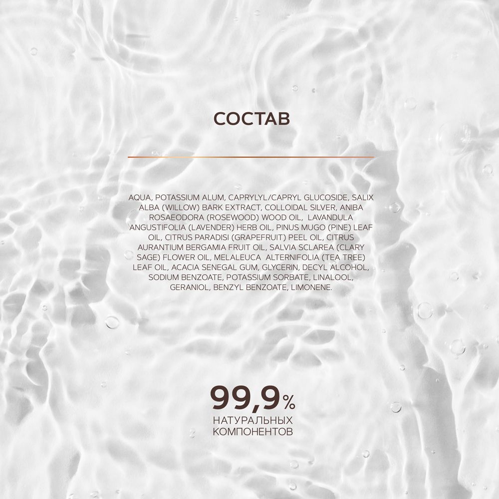 Вода, Полиглицерил-4 капрат, Коллоидное серебро, Сосна, Масло лаванды эфирное, Чайное дерево, Этилгексилглицерин, Масло эфирное бергамота, Масло эфирное бергамота, Квасцы аммония, Ива белая, Розовое дерево, Грейпфрут, Токоферола ацетат