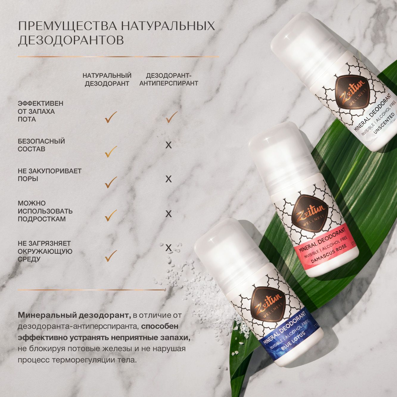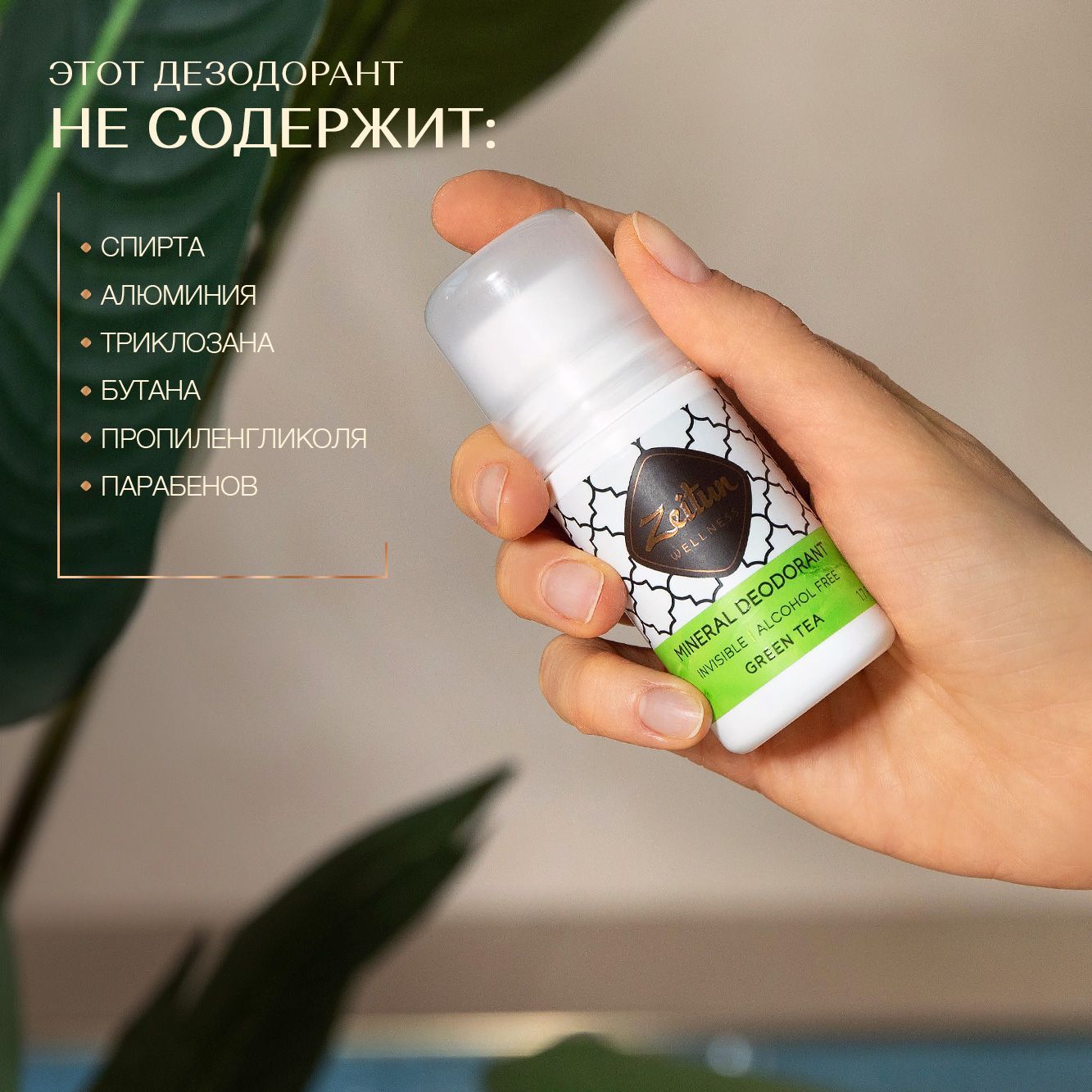 Zeitun Дезодорант женский шариковый минеральный с коллоидным серебром, натуральный "Зеленый чай" от запаха пота и не оставляет следов на одежде50 мл