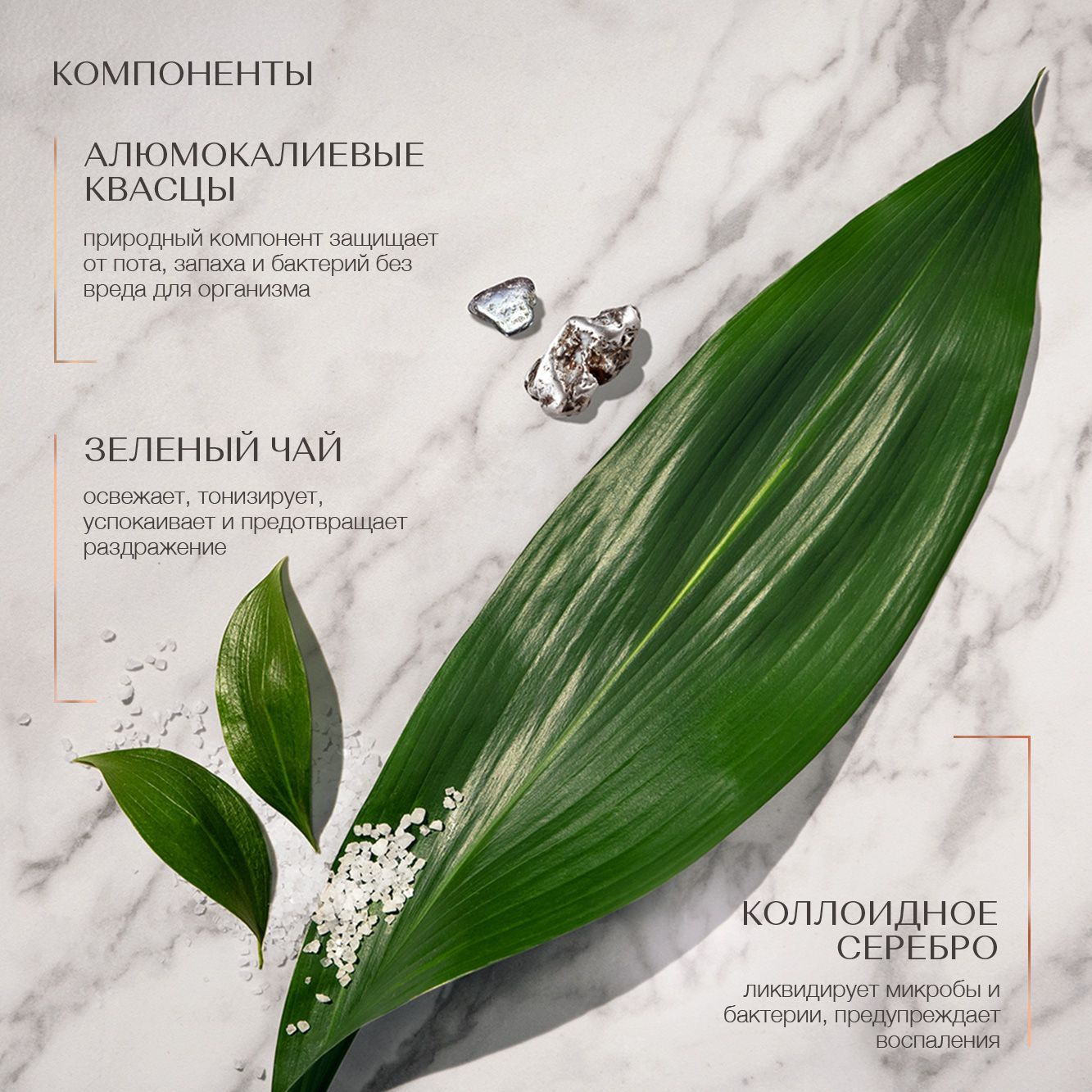 Aqua, Ammonium Alum (натуральные квасцы), Aloe Barbadensis Leaf Extract (экстракт алоэ вера), Camellia Sinensis Leaf Extract (экстракт зеленого чая), Xanthan Gum, Ethylhexylglycerin, Benzyl Alcohol, Colloidal Silver (серебро), Parfum.