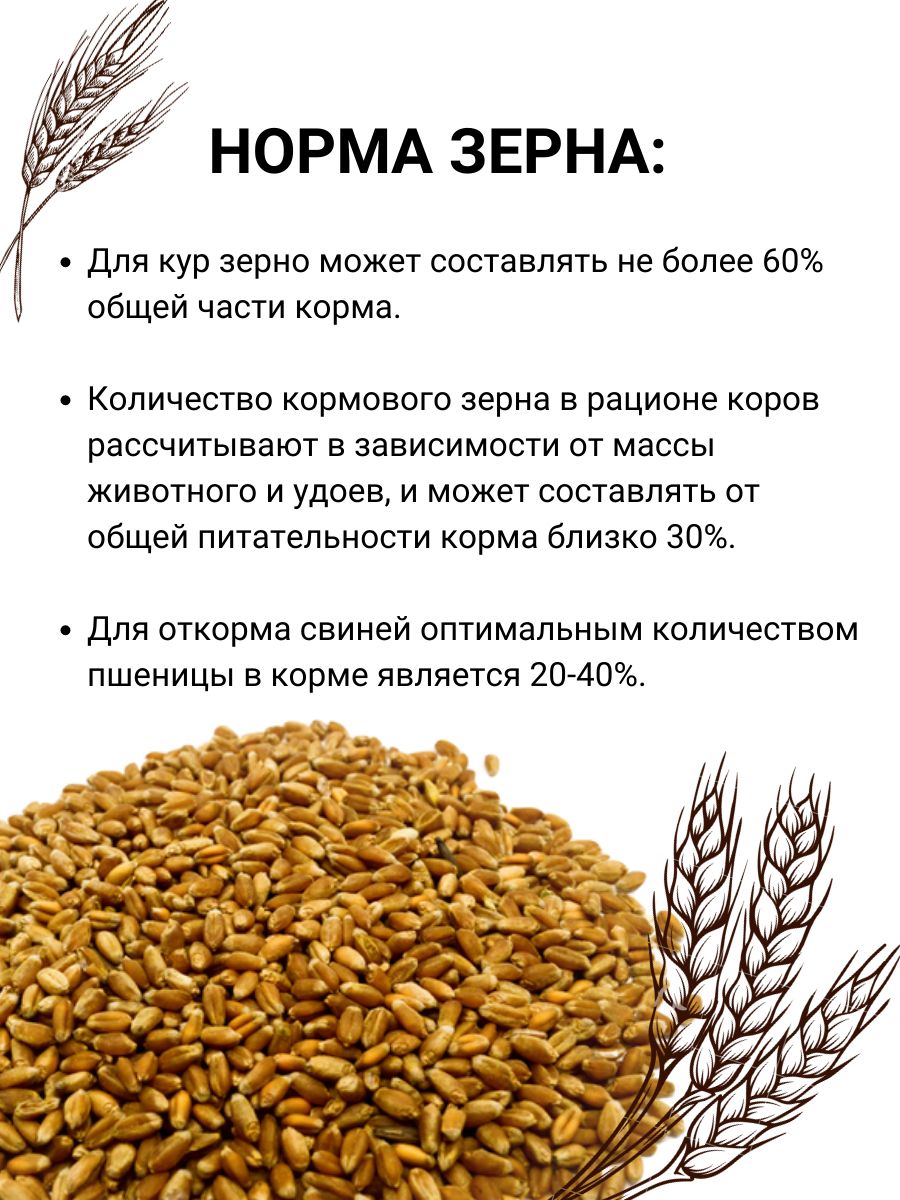 Описание: Кормовая пшеница зерно. Кормовая пшеница очень ценный и полезный продукт для животных. Она наделена всеми необходимыми витаминами и микро и макроэлементами, лизином, аминокислотами, фосфором, благоприятно влияющих на развитие и здоровье скота. Пшеницу кормовую используют для вскармливания овец, свиней, коров, кроликов, кур, гусей, уток, других животных и птиц. В пшенице большая концентрация углеводов позволяет не накапливать влагу внутри зерна, что продлевает годность зерна . Ее применяют для изготовления комбинированных кормов. Если пшеницу использовать в качестве единственного источника питания, она может нанести вред животным. Для компенсации недостатков рекомендуется вместе с пшеницей давать животным кукурузу, ячмень, овощи, сено, пшено, овес, свежую траву, дополнительные источники лизина и фосфора-обменные процессы организма стабилизируются, улучшается здоровье и развитие животных. Лизин - стабилизирует обмен аминокислот. Фосфор - помогает компонентам усвоится. По общей питательности зерно пшеницы уступает только кукурузе, но по содержанию протеина превосходит все другие злаковые. В 1 кг зерна пшени­цы в среднем содержится 1,07-1,37 ЭКЕ и 120 г переваримого протеина. Пшеница также подойдёт для приготовления самогона и ряда других спиртных напитков. ГОСТ 54078-2010 Пшеница зерно 1 кг , 3 кг , 5 кг , 10 кг , 20 кг