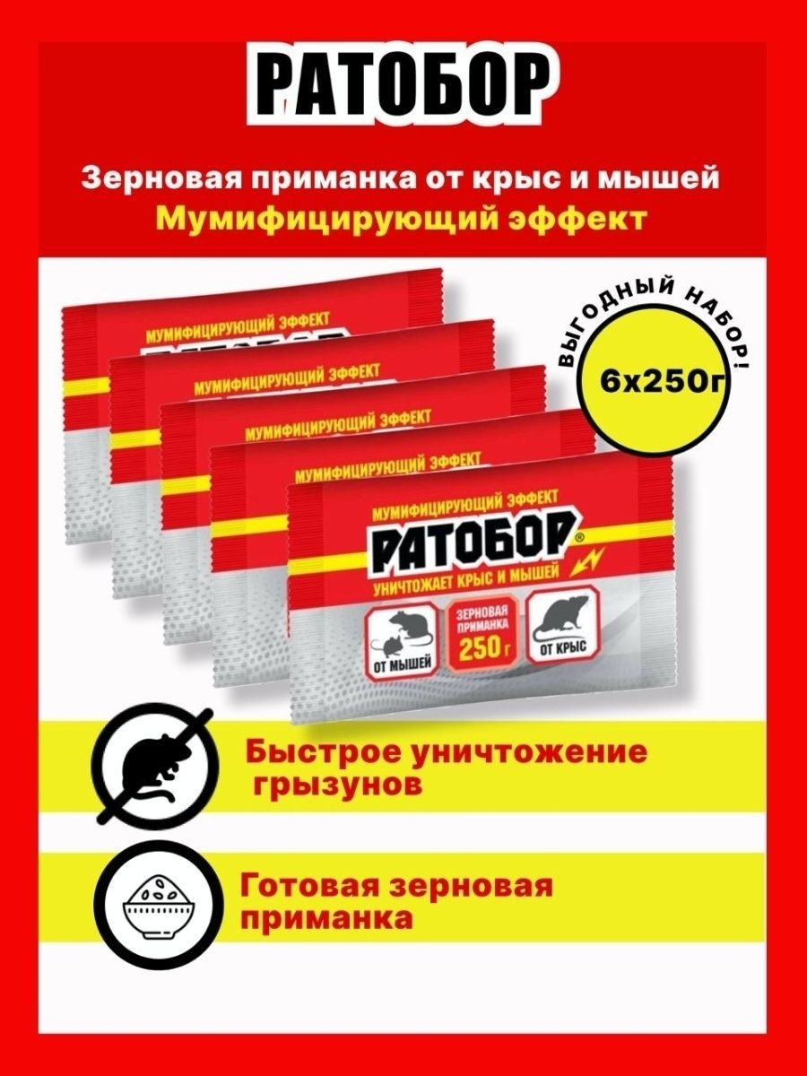 Зерновая приманка Ратобор, 250 г - 6 упаковок, средство от мышей и крыс, от грызунов с эффектом мумификации, Ваше Хозяйство