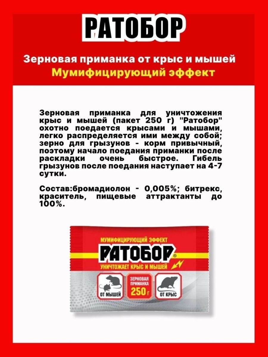 Описание: Средство от мышей и крыс РАТОБОР - эффективная защита от грызунов как в быту, так и на различных промышленных предприятиях, в торговых помещениях и заведениях общественного питания. Отрава от мышей, крыс Ратобор это готовая приманка. Предназначена для борьбы от мышей, крыс, полевых мышей, водяных крыс. Охотно поедается вредителями, легко распределяется ими между собой;зерно для грызунов — корм привычный, поэтому начало поедания приманки после раскладки очень быстрое. Тушки умерших грызунов мумифицируются и не издают неприятного запаха. От мышей в для грызунов средство имеет притягательный вкус и запах, тем самым притягивая грызунов. Отрава от крыс попадает в желудок грызуну и разрушает внутренние органы. Как правило смерть наступает через 5-8 дней. ПРИМЕНЕНИЕ: приманку насыпают на подложки (б/у жестяные крышки, картонки) или в ёмкости (консервные банки, лотки и т. п.) по 1 стол. ложке против мышей и по 2 ст. ложки против крыс вблизи от нор, вдоль стен через 2–4 м. Так повышается поедаемость и уменьшается растаскивание грызунами. Знайте! Грызуны «осваивают» всю территорию, поэтому важен не большой объём одной дозы, а как можно больше маленьких доз на путях передвижения грызунов. Чем больше точек раскладки, тем эффективнее «сработает» приманка! Раскладку при необходимости повторяют через 7–10 дней до исчезновения грызунов. Приманки для крыс и мышей расставляются у нор, вдоль стен, по линиям передвижения серых пришельцев через промежутки. Средство от мышей содержит химикат Битрекс, который имеет горьковатый вкус, что предотвращает попадание отравы в рот домашним питомцам. В яд для мышей и крыс входит антикоагулянт второго поколения - бродифакум. Крысы и мыши погибают даже после однократного приёма приманки для мышей на основе этого препарата. Гарантийный срок хранения: 2 года.