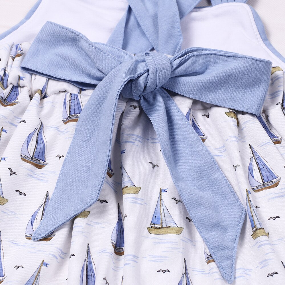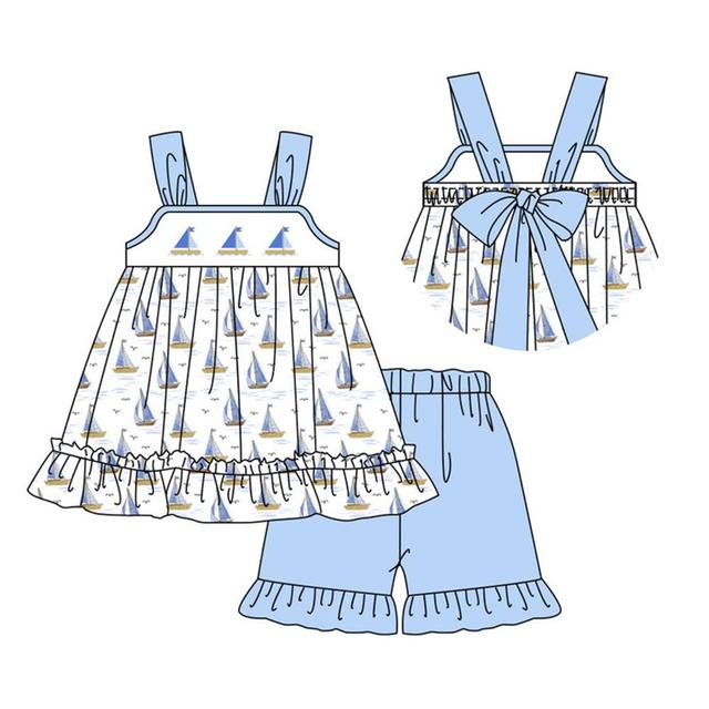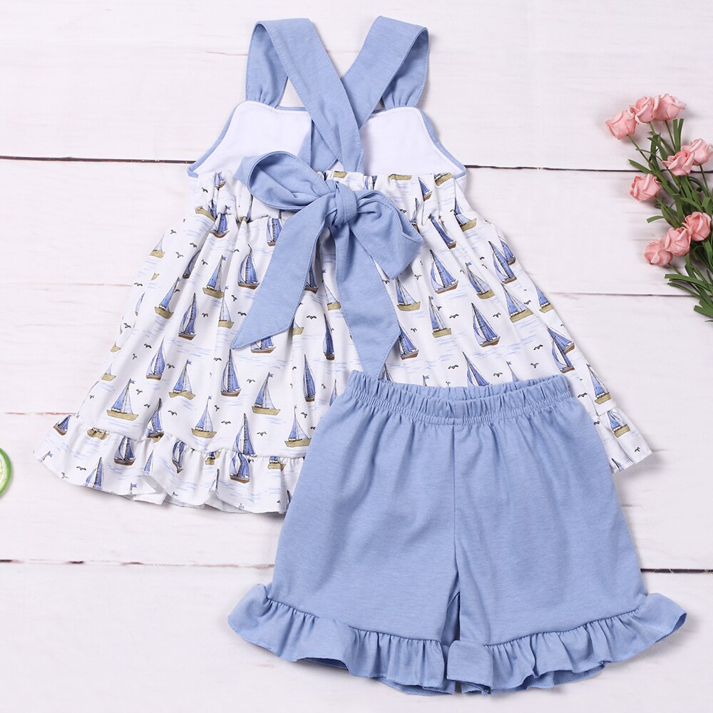Женская летняя одежда для девочек, повседневная одежда с принтом, хлопковые короткие комплекты с синими брюками, Детские наряды с бантом, крутая кофта