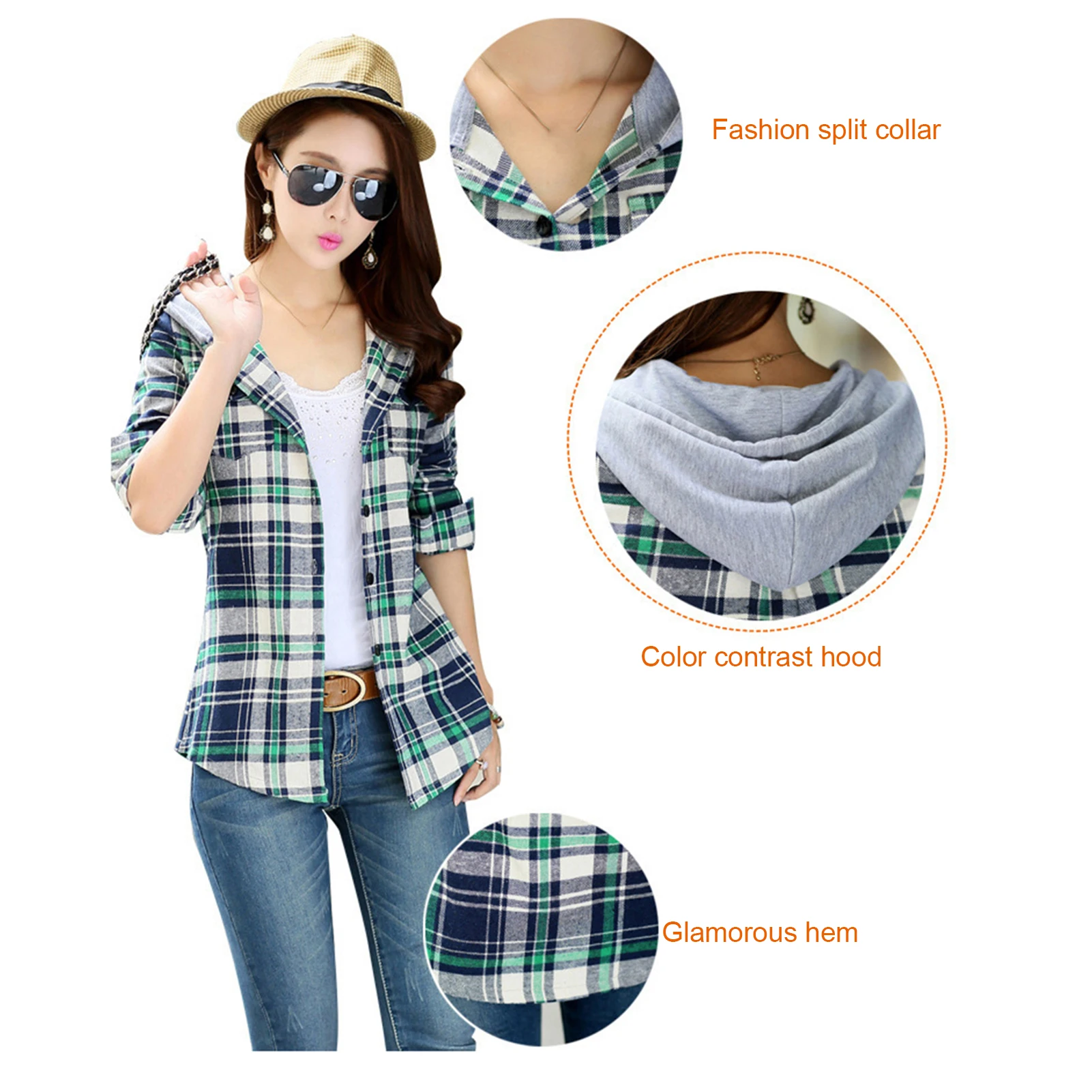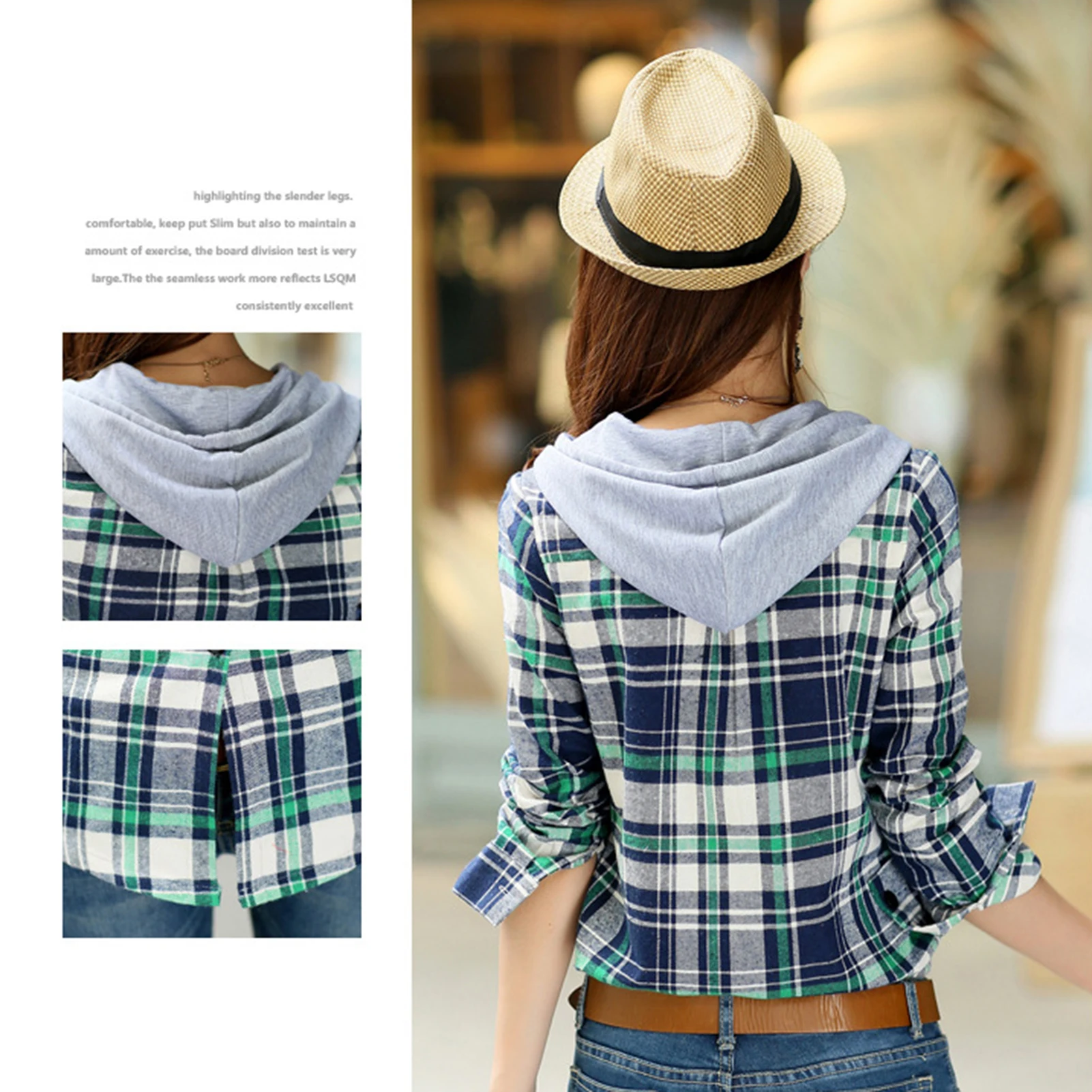 Женская модная свободная Классическая хлопковая рубашка в клетку с длинным рукавом и капюшоном на пуговицах