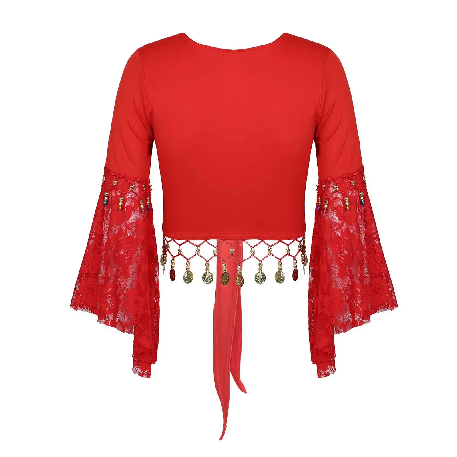 Женский костюм для танца живота, кружевной лоскутный с расклешенным рукавом и бахромой, укороченный топ со шнуровкой и шалью.