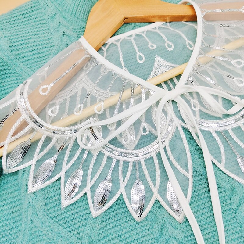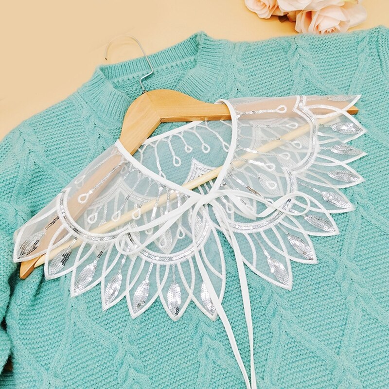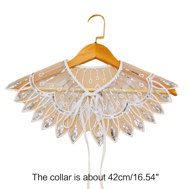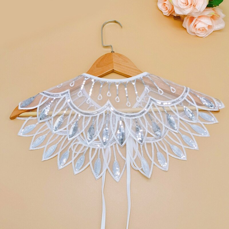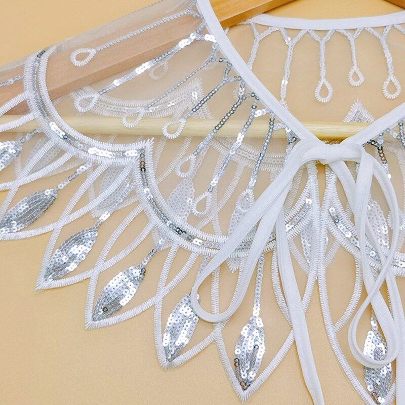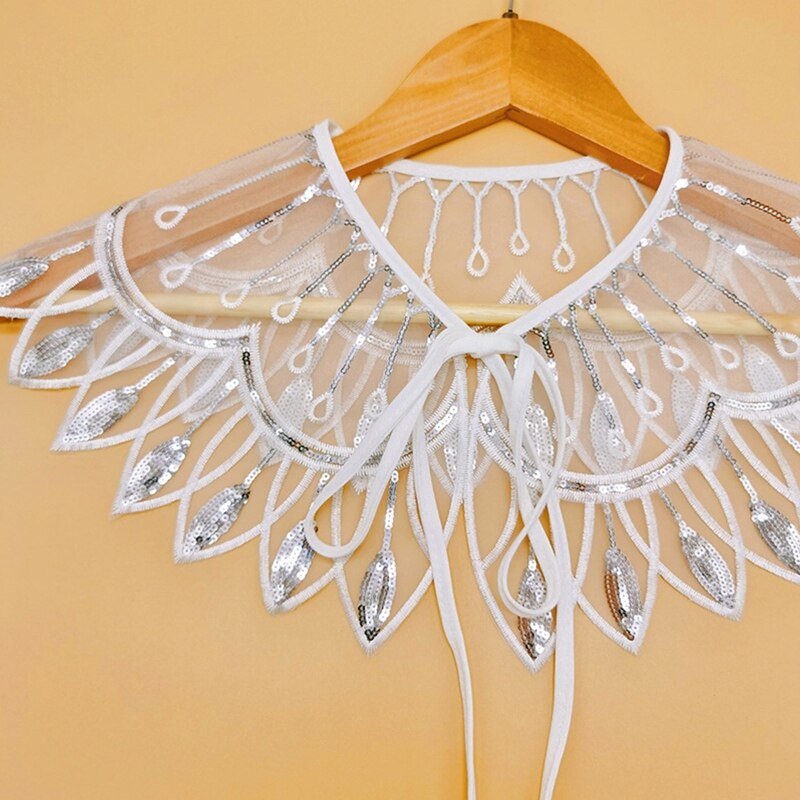Прозрачный сетчатый накладной воротник, металлические блестки с вышивкой, блестящий дизайн в форме перьев, бант на шнуровке.