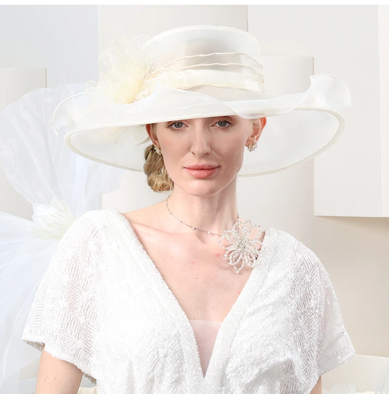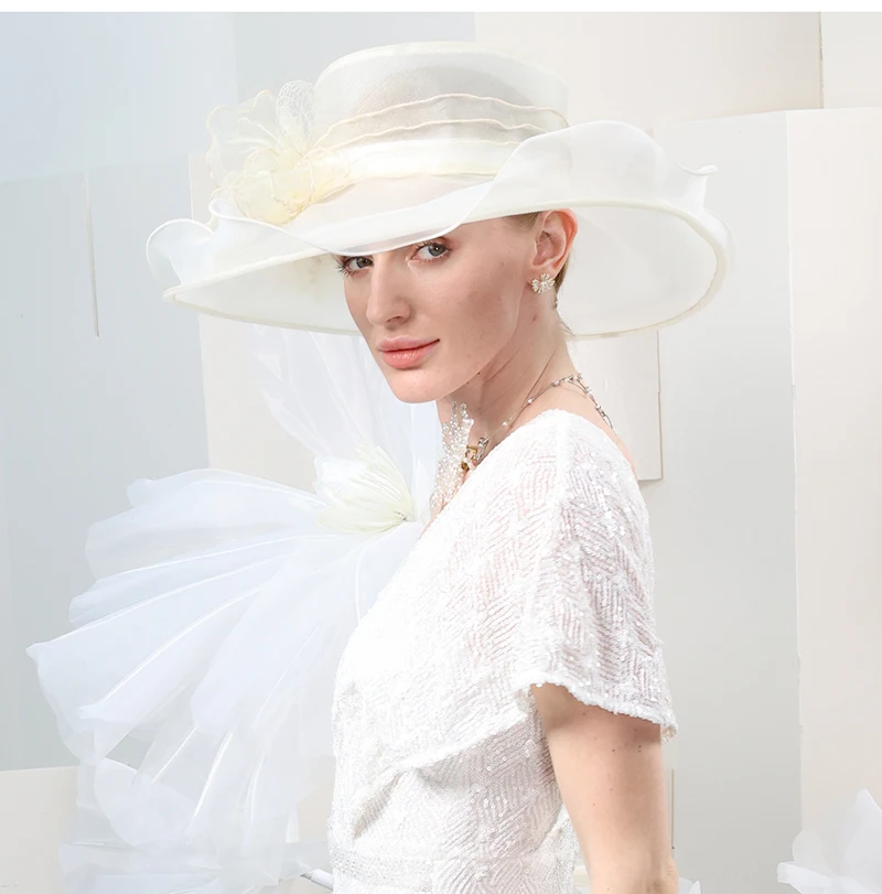 FS элегантные женские шляпы с большими полями Fedora Кентукки Дерби для женщин из органзы Шампанское солнце Millinery цветок Свадебная вечеринка церковная Кепка