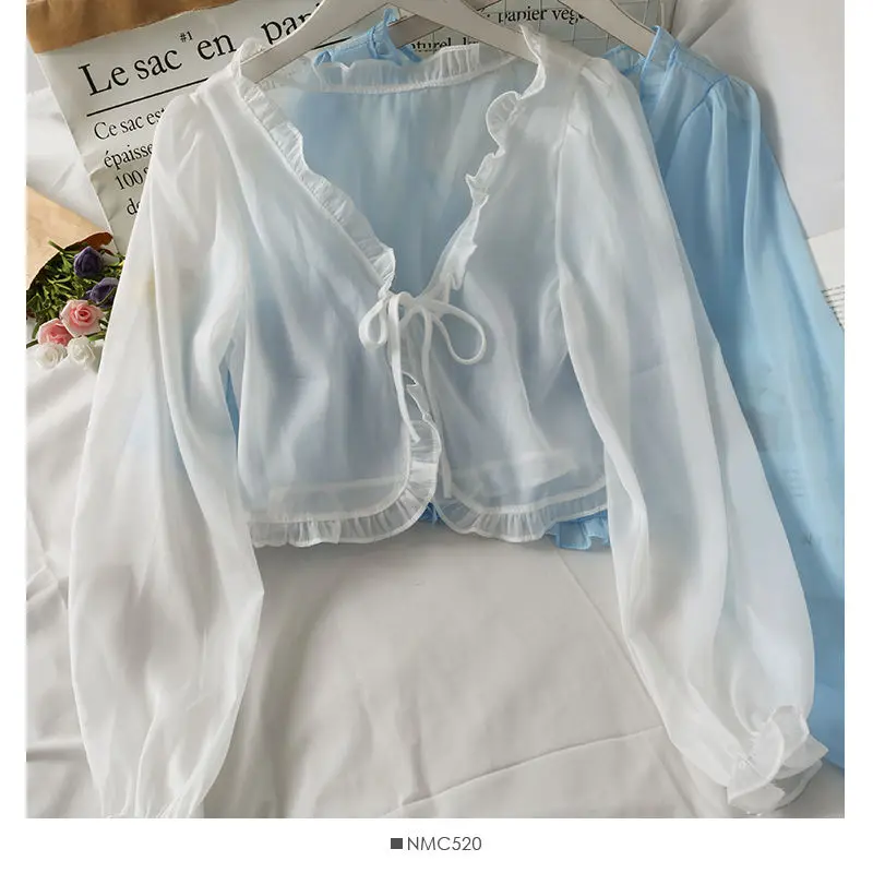 Женская Солнцезащитная кофта ALANOS, белый кардиган с кружевным бантом и оборками, рубашка с чехлом, корейский стиль, Y2K, на лето