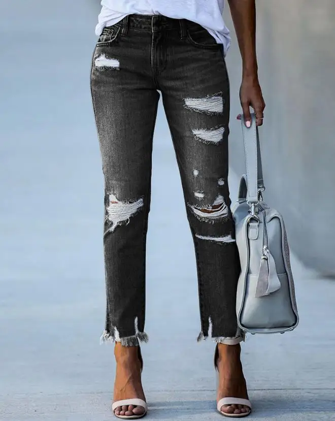 Женские брюки из денима, модные повседневные Простые рваные узкие джинсы на молнии с перфорацией и необработанным подолом