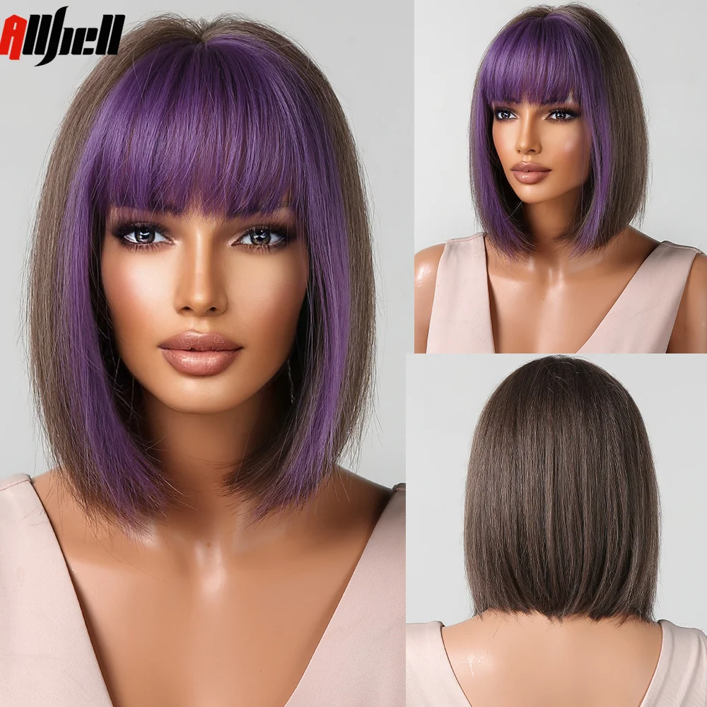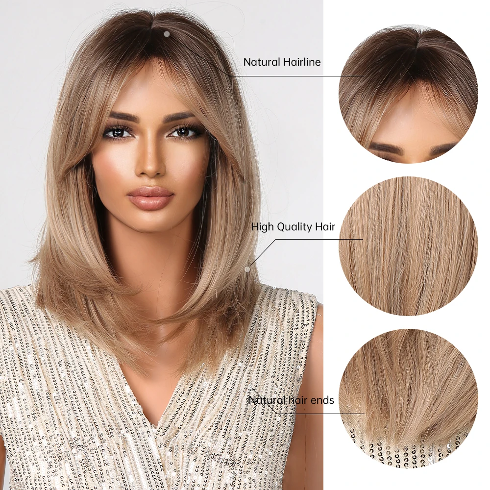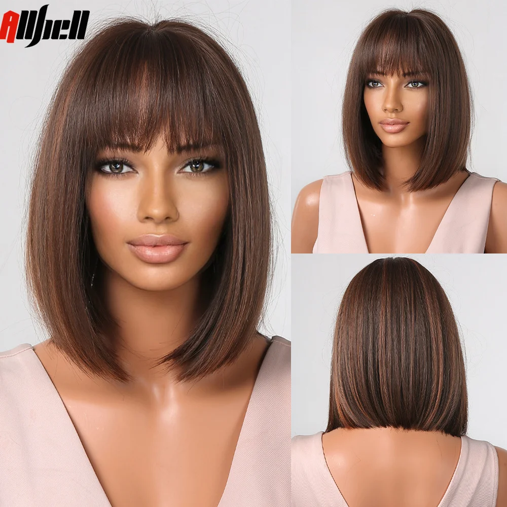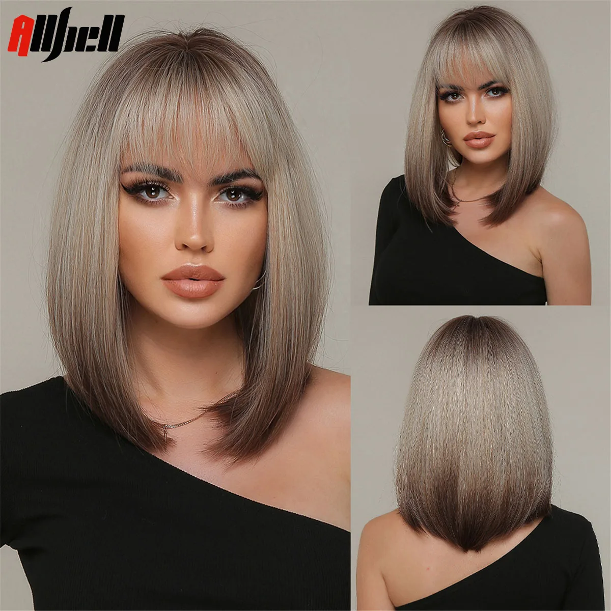 Ombre Светло-коричневые короткие прямые парики с челкой Длина до плеч Женский многослойный парик Термостойкий для повседневного использования на вечеринках для женщин
