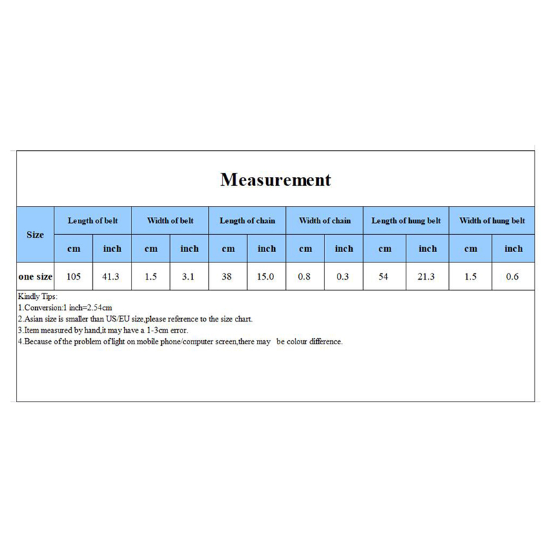 Размер: один размер, длина ремня: 105 см Ширина: 1,5 см Длина подвесной цепи: 38 см Ширина: 0,8 см Длина подвешенного ремня: 54 см Ширина: 1,5 см