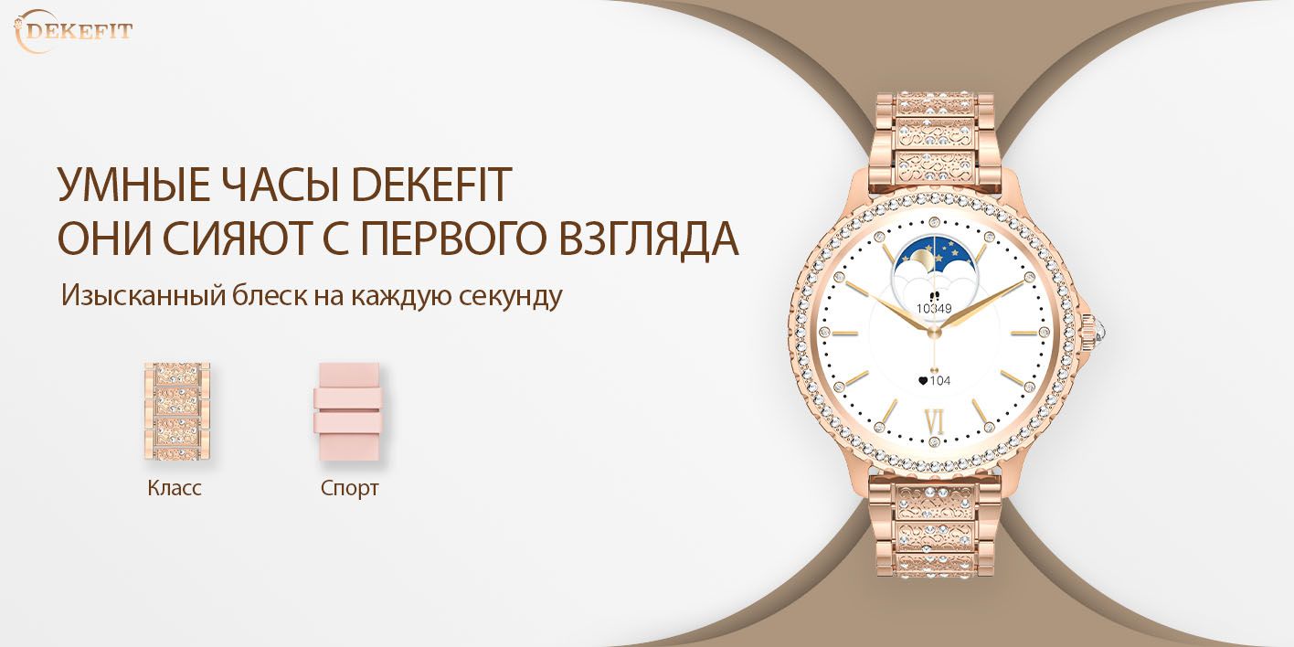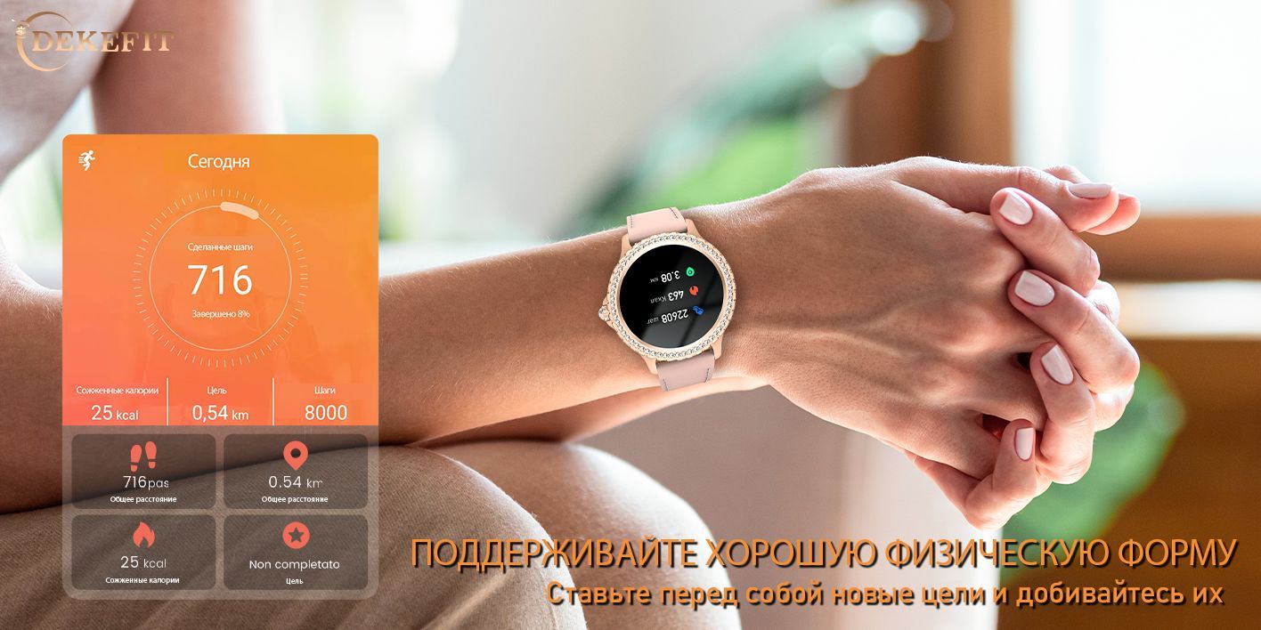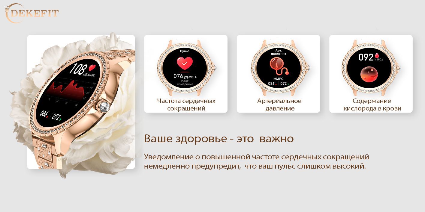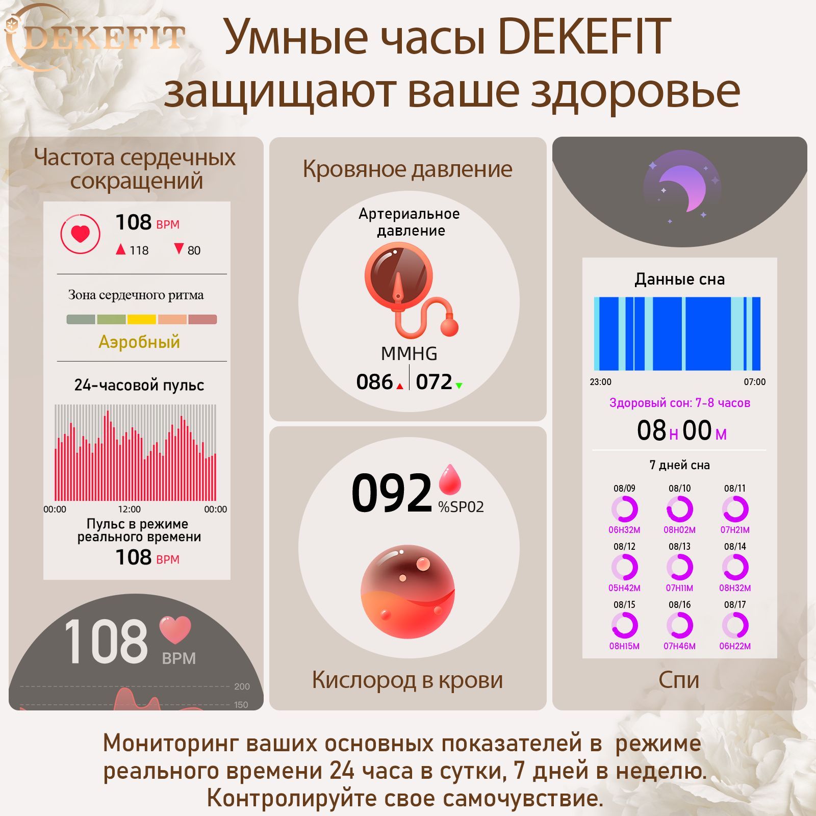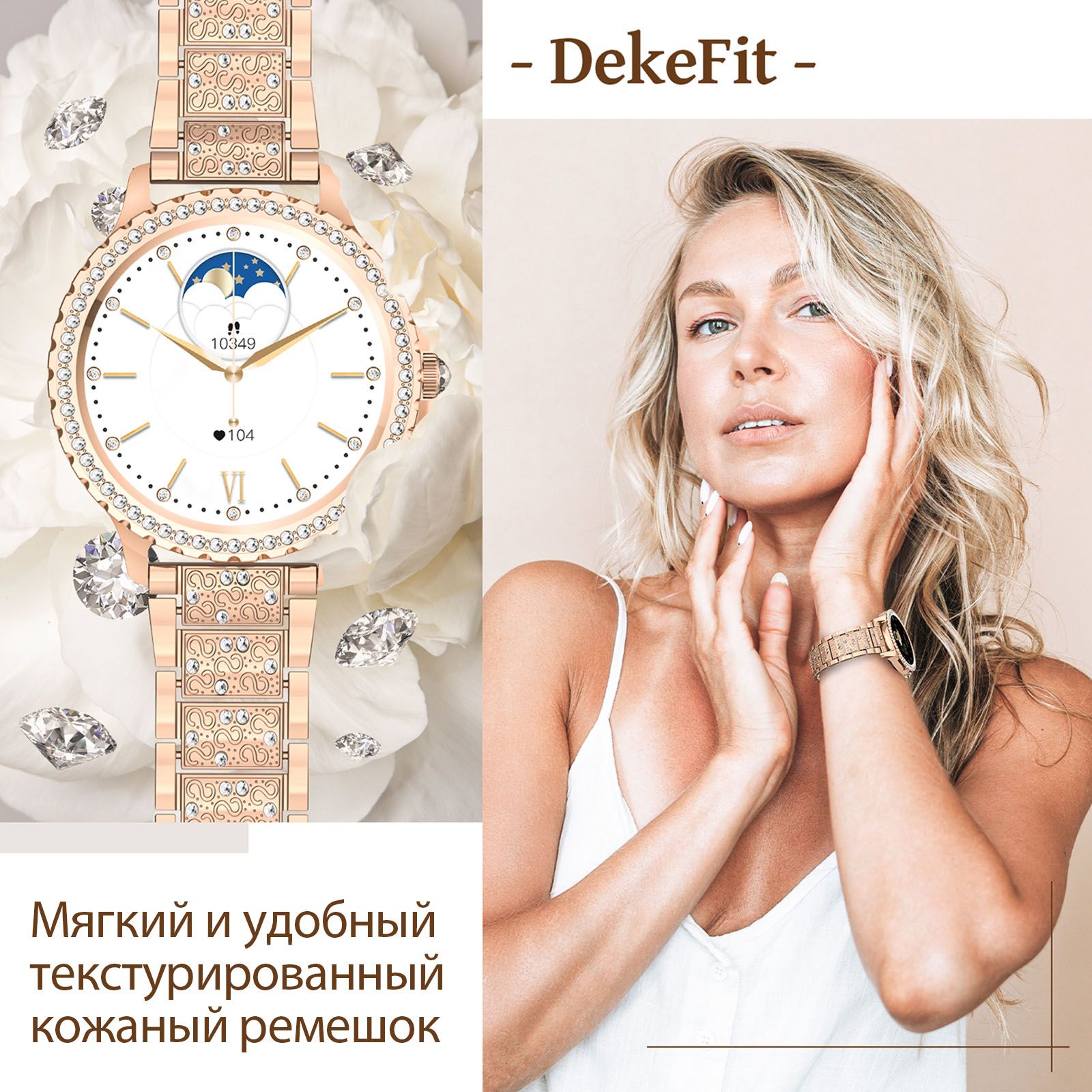 2、Мягкий и приятный коже ремешок из розового жидкого силикона - ваш лучший спортивный компаньон.Управляйте своей жизнью с учетом здоровьяСмарт-часы могут мониторить пульс, уровень кислорода в крови и кровяное давление в любое время суток. Они также способны записывать и анализировать данные о сне за 7 дней. Это поможет вам лучше понять свое тело и осуществлять всесторонний уход за здоровьем.Следите за своим здоровьемЖенские фитнес-часы DekeFit оснащены новым оптическим датчиком движения, который предоставляет более точные данные, отслеживает вашу активность весь день -  количество шагов, пройденное расстояние, время занятий спортом, количество сожженных калорий - помогая вам научно поддерживать фигуру.Создано специально для женщинНаш модный женский смарт-часы DekeFit имеет классический повседневный стиль. Часы автоматически отслеживают ваш сон и анализируют его качество по глубокому сну, легкому сну и пробуждениям. Они также имеют функцию напоминания о долгом сидении, напоминания о питье и функцию напоминания о менструации. Это идеальный подарок для важных женщин в вашей жизни.20 видов спортивных режимовЭти женские спортивные часы имеют 1,32-дюймовый цветной экран с разрешением 360 x 360 пикселей. Они поддерживают 20 режимов тренировок, включая пешие походы, баскетбол, футбол, альпинизм, велосипедные прогулки, бадминтон и многое другое.Упростите свою жизньОн не только имеет красивый внешний вид, но и обладает множеством полезных функций, таких как голосовой помощник AI, парольная блокировка, напоминание о сидячем образе жизни, напоминание о питье, погода, управление камерой, воспроизведение музыки, будильник, секундомер, фонарик и многое другое.... Он имеет высокую совместимость и идеально подходит для Android 4.4 и iOS 7.1 и выше. Умные часы DekeFit для женщин имеют более 260 пользовательских интерфейсов и настраиваемые циферблаты, позволяющие выразить ваш стиль на запястье. Это идеальный подарок для подруги/матери/девушки.Сияйте как звездаЭтот интеллектуальный женский часовой ремешок имеет гладкое стекло с закругленными краями 2.5D и высокой четкостью, покрытое покрытием с вакуумным напылением, что делает его более устойчивым к царапинам. На безель вставлено 60 круглых бриллиантов и бриллиантовая корона. Использование ювелирной вставки делает его более прочным и надежным, предотвращая выпадение. Носите интеллектуальные часы DekeFit и вы будете выделяться среди толпы.Принимайте звонки и получайте сообщенияЖенские умные часы поддерживают Bluetooth 5.2 для стабильного соединения и быстрого сопряжения. Встроенный высококачественный стерео динамик и микрофон с шумоподавлением восстанавливают реалистичность звонков, вы можете принимать и совершать звонки в любое время. Кроме того, умные часы также могут получать уведомления в режиме реального времени от SMS, WhatsApp, Facebook, Instagram и других приложений. Вы никогда не пропустите важную информацию.