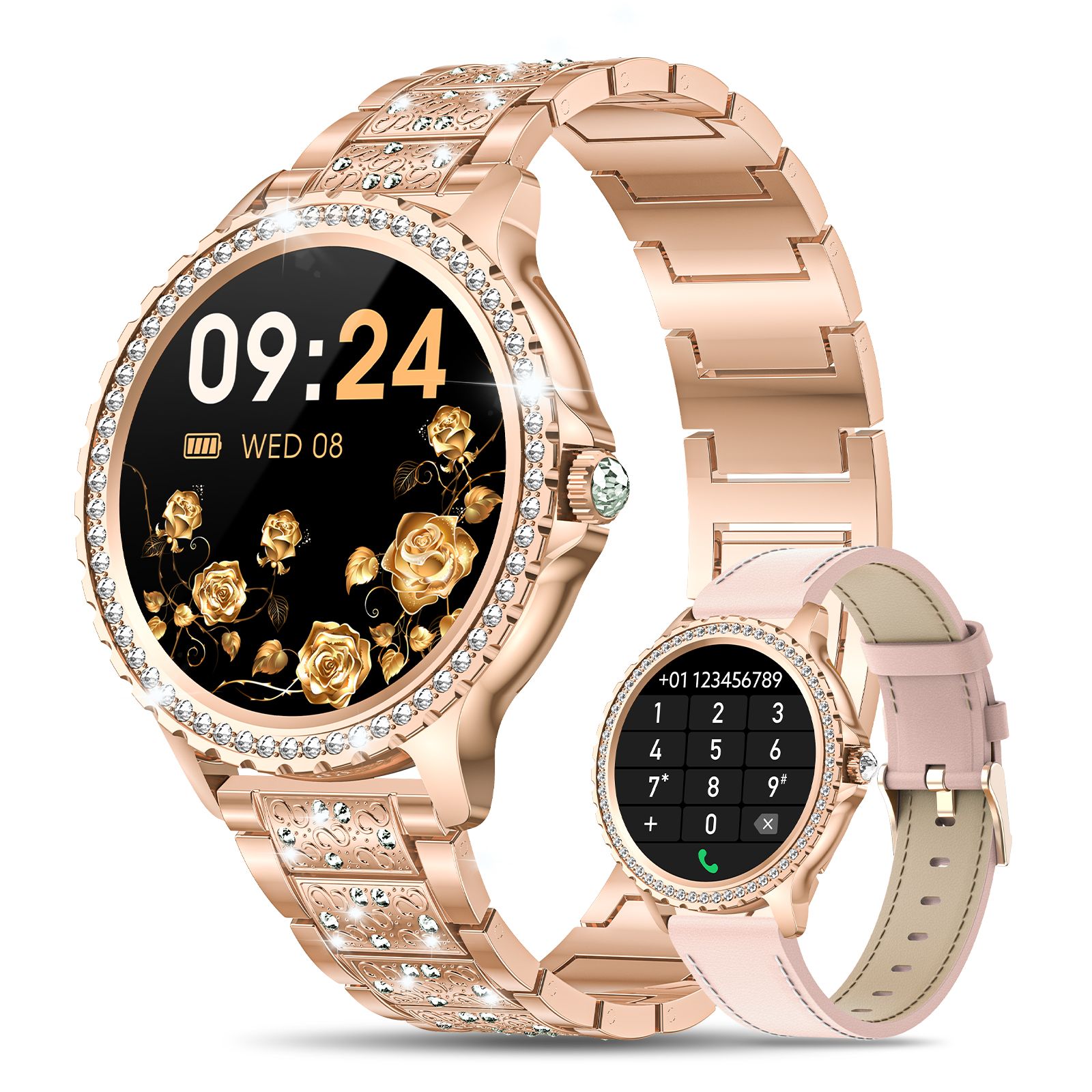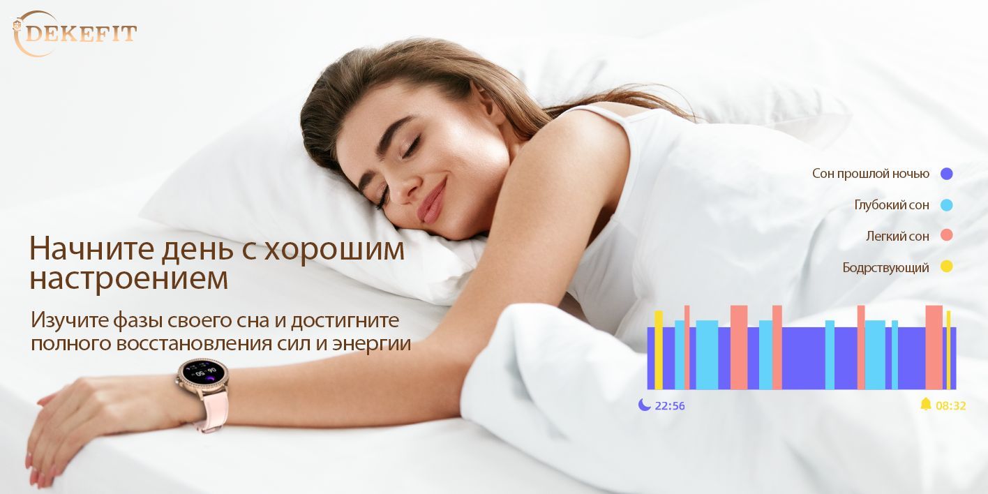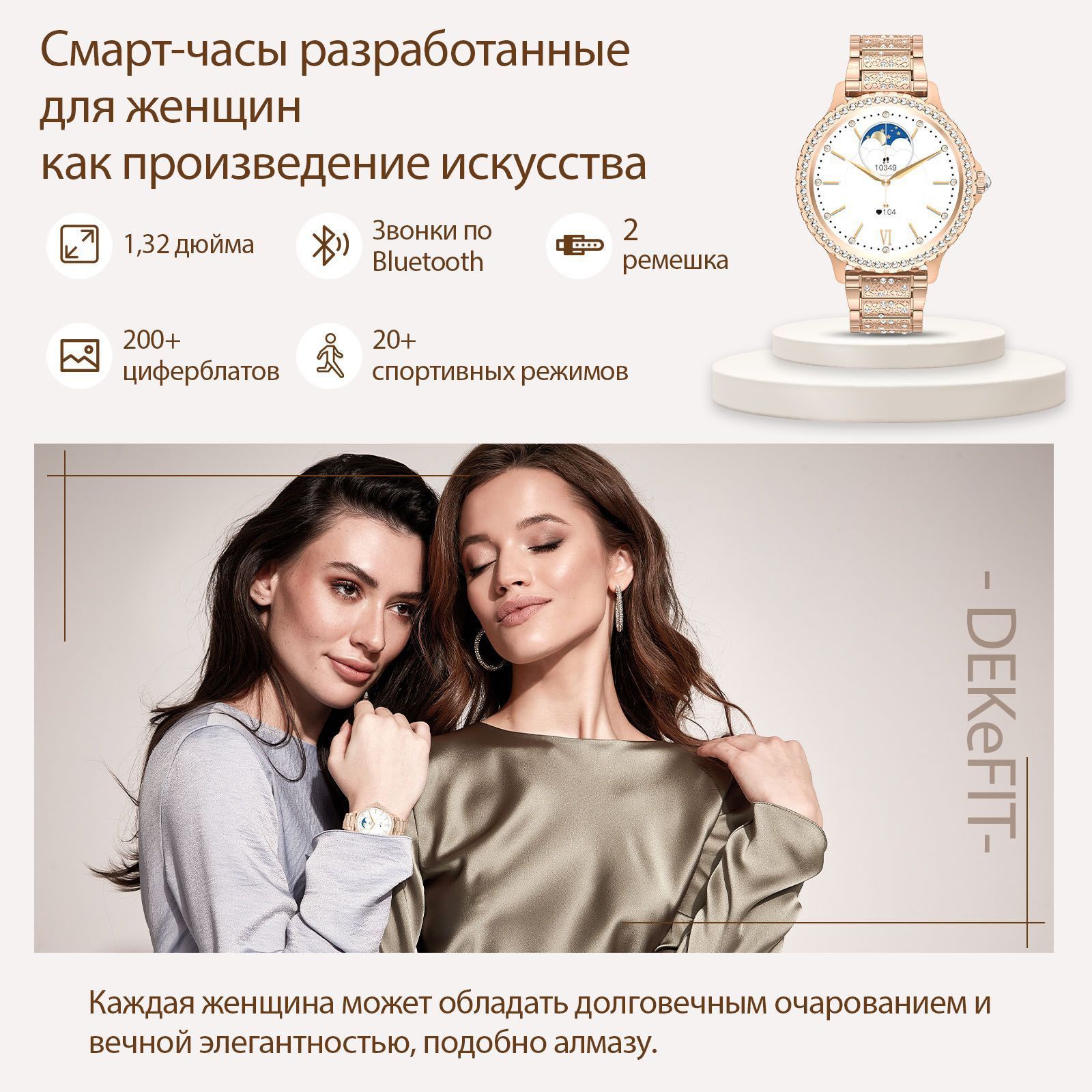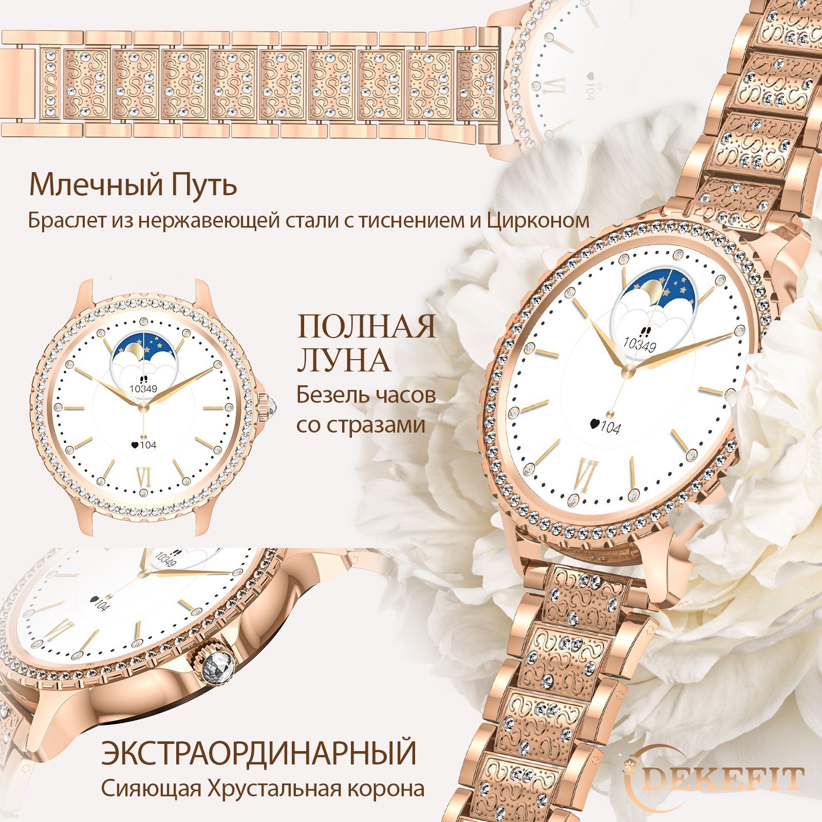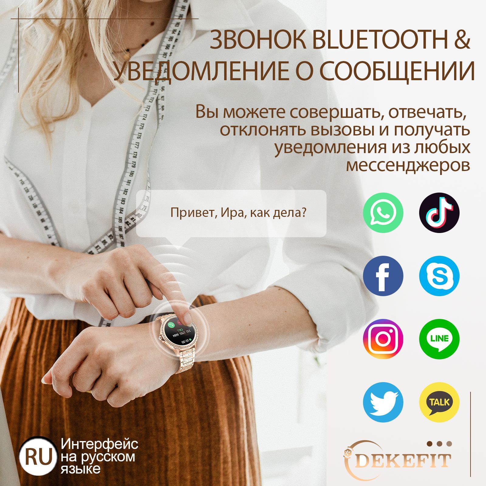 2、Мягкий и приятный коже ремешок из розового жидкого силикона - ваш лучший спортивный компаньон.Управляйте своей жизнью с учетом здоровьяСмарт-часы могут мониторить пульс, уровень кислорода в крови и кровяное давление в любое время суток. Они также способны записывать и анализировать данные о сне за 7 дней. Это поможет вам лучше понять свое тело и осуществлять всесторонний уход за здоровьем.Следите за своим здоровьемЖенские фитнес-часы DekeFit оснащены новым оптическим датчиком движения, который предоставляет более точные данные, отслеживает вашу активность весь день -  количество шагов, пройденное расстояние, время занятий спортом, количество сожженных калорий - помогая вам научно поддерживать фигуру.Создано специально для женщинНаш модный женский смарт-часы DekeFit имеет классический повседневный стиль. Часы автоматически отслеживают ваш сон и анализируют его качество по глубокому сну, легкому сну и пробуждениям. Они также имеют функцию напоминания о долгом сидении, напоминания о питье и функцию напоминания о менструации. Это идеальный подарок для важных женщин в вашей жизни.20 видов спортивных режимовЭти женские спортивные часы имеют 1,32-дюймовый цветной экран с разрешением 360 x 360 пикселей. Они поддерживают 20 режимов тренировок, включая пешие походы, баскетбол, футбол, альпинизм, велосипедные прогулки, бадминтон и многое другое.Упростите свою жизньОн не только имеет красивый внешний вид, но и обладает множеством полезных функций, таких как голосовой помощник AI, парольная блокировка, напоминание о сидячем образе жизни, напоминание о питье, погода, управление камерой, воспроизведение музыки, будильник, секундомер, фонарик и многое другое.... Он имеет высокую совместимость и идеально подходит для Android 4.4 и iOS 7.1 и выше. Умные часы DekeFit для женщин имеют более 260 пользовательских интерфейсов и настраиваемые циферблаты, позволяющие выразить ваш стиль на запястье. Это идеальный подарок для подруги/матери/девушки.Сияйте как звездаЭтот интеллектуальный женский часовой ремешок имеет гладкое стекло с закругленными краями 2.5D и высокой четкостью, покрытое покрытием с вакуумным напылением, что делает его более устойчивым к царапинам. На безель вставлено 60 круглых бриллиантов и бриллиантовая корона. Использование ювелирной вставки делает его более прочным и надежным, предотвращая выпадение. Носите интеллектуальные часы DekeFit и вы будете выделяться среди толпы.Принимайте звонки и получайте сообщенияЖенские умные часы поддерживают Bluetooth 5.2 для стабильного соединения и быстрого сопряжения. Встроенный высококачественный стерео динамик и микрофон с шумоподавлением восстанавливают реалистичность звонков, вы можете принимать и совершать звонки в любое время. Кроме того, умные часы также могут получать уведомления в режиме реального времени от SMS, WhatsApp, Facebook, Instagram и других приложений. Вы никогда не пропустите важную информацию.