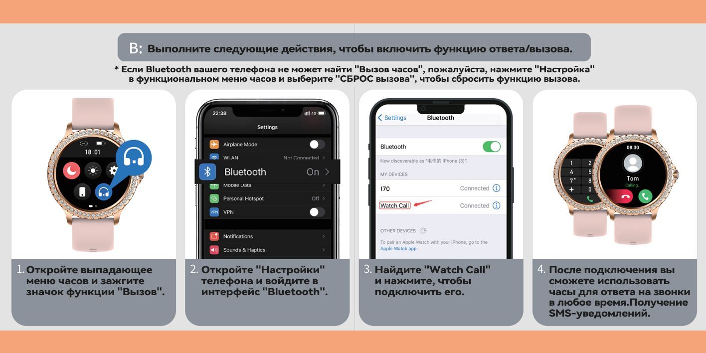 Войдите в настройки Bluetooth мобильного телефона и подключитесь к аудиосистеме Bluetooth часов (обратите внимание, что Bluetooth часов должен быть включен, второй раз - это аудиосвязь, которая является ключом к совершению вызова).