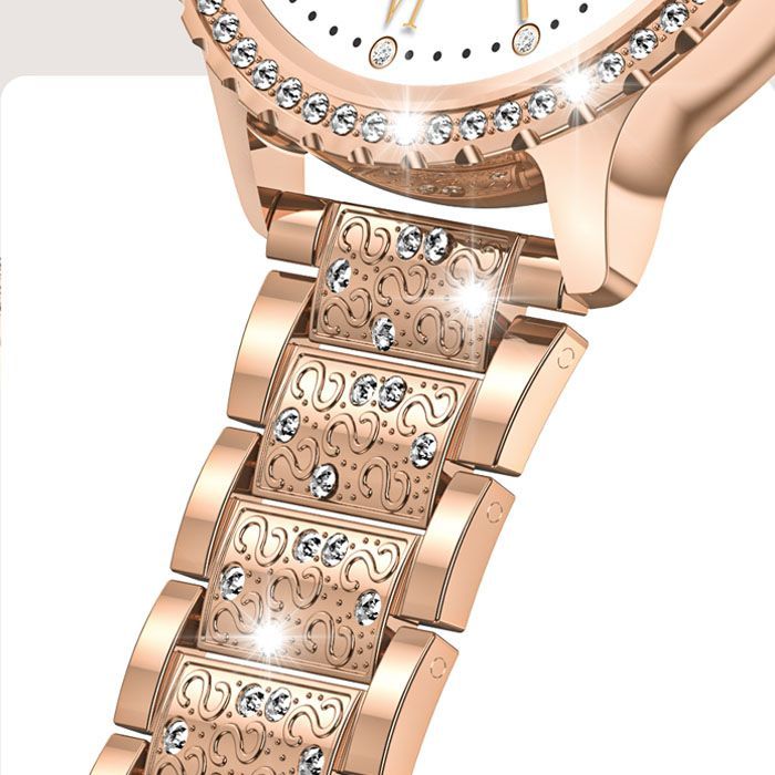 Описание: Оснащено 2-мя сменными ремешками1、Ремешок из золотой стали с инкрустацией бриллиантов и рунами, сочетается с бриллиантовым циферблатом, чтобы вы сияли на вечеринке.