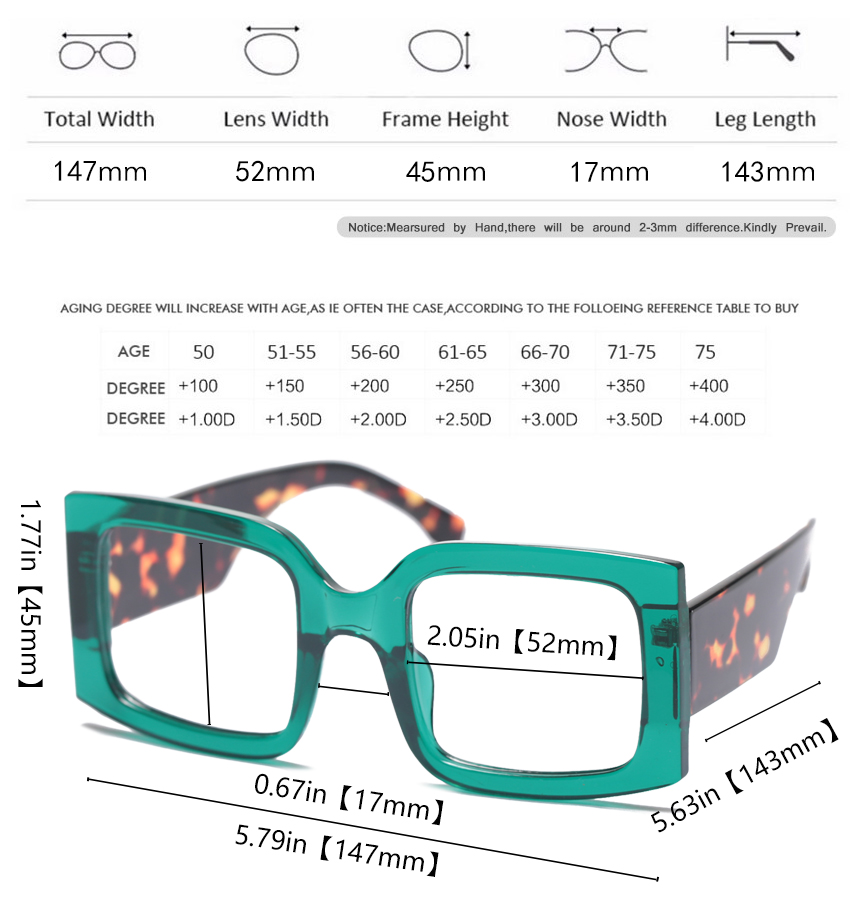 -Ширина линз: 52 мм/2,05 дюйма, высота: 45 мм/1,77 дюйма, длина мостика: 17 мм/0,67 дюйма, длина дужки: 143 мм/5,63 дюйма, общая длина: 147 мм/5,79 дюйма