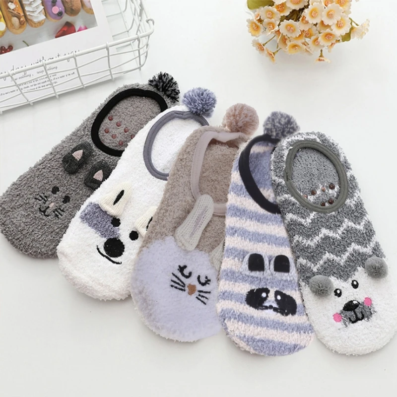 Женские зимние пушистые теплые тапочки, носки для пола, милые бархатные чулочно-носочные изделия с мультяшными животными и вышивкой, 1 пара