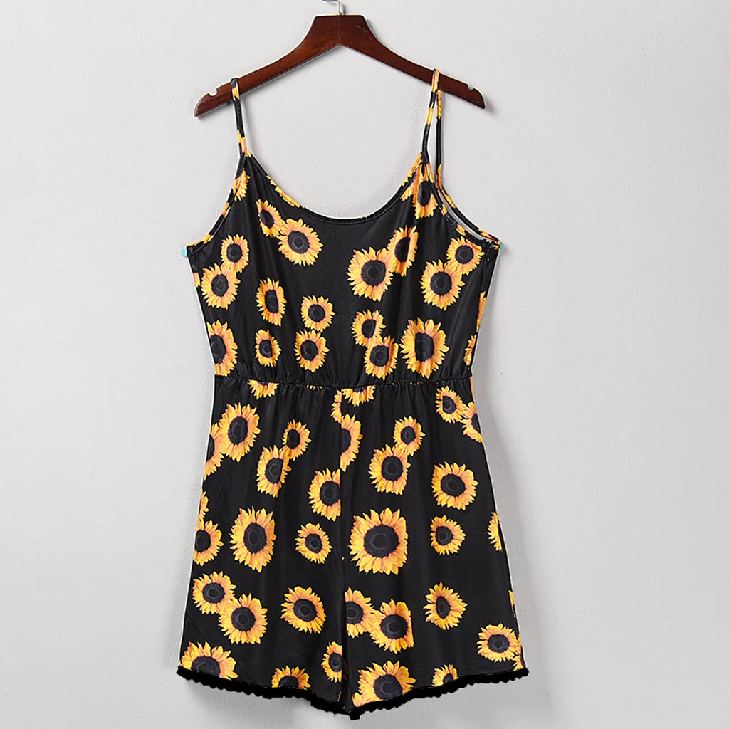 Женские мини-комбинезоны с круглым вырезом и принтом подсолнухов