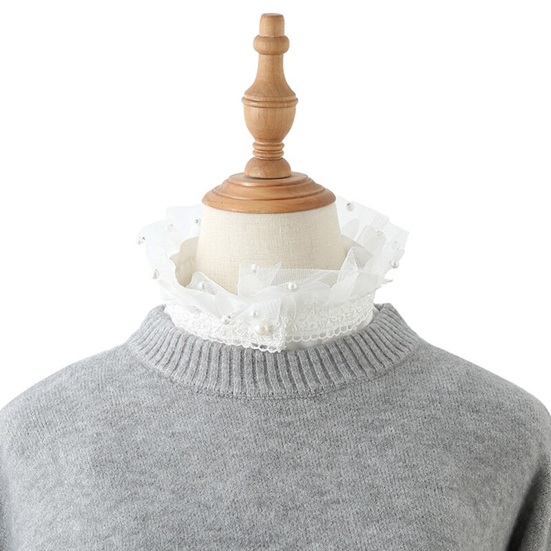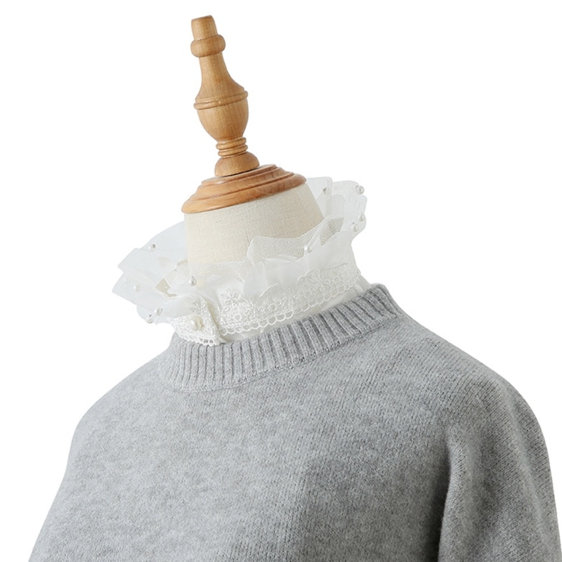 Воротник: имитация жемчуга, бисером и цветочными кружевными оборками, стоячий воротник, на пуговицах, белый цвет.