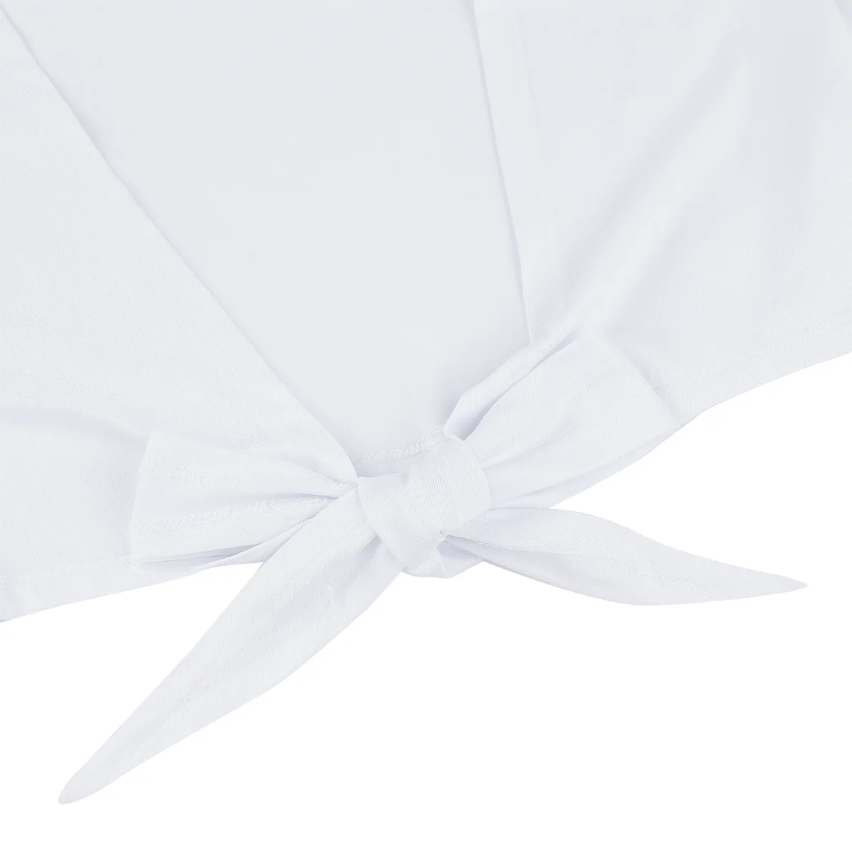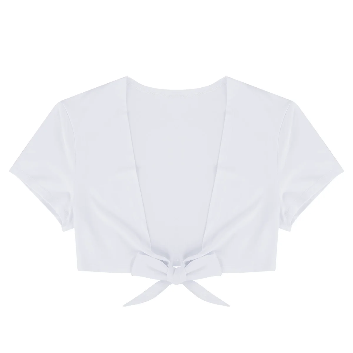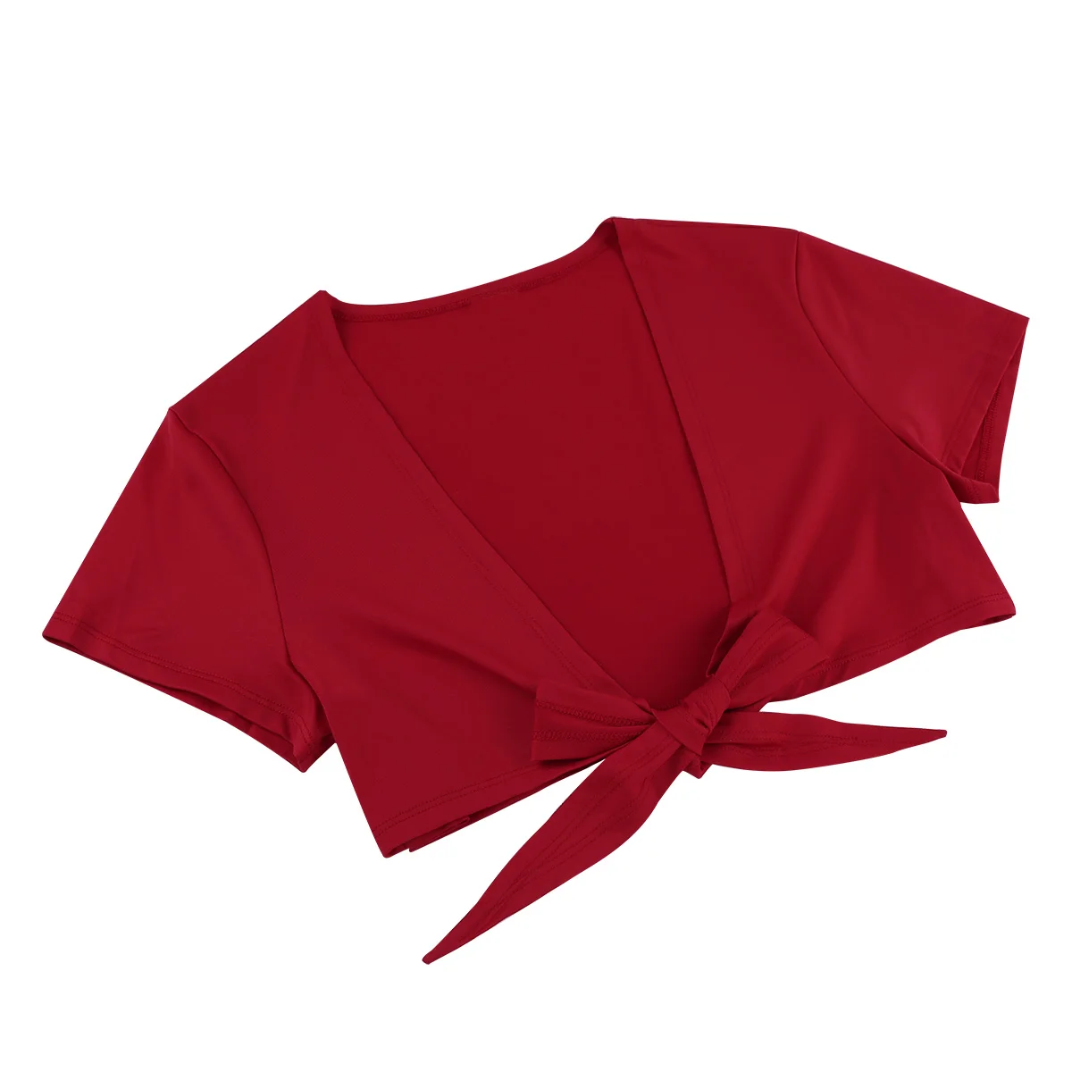 • Укороченный топ с глубоким v-образным вырезом и короткими рукавами, завязывается спереди. Пара плиссированной мини-юбки с низкой посадкой.