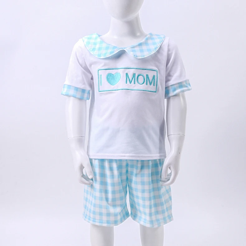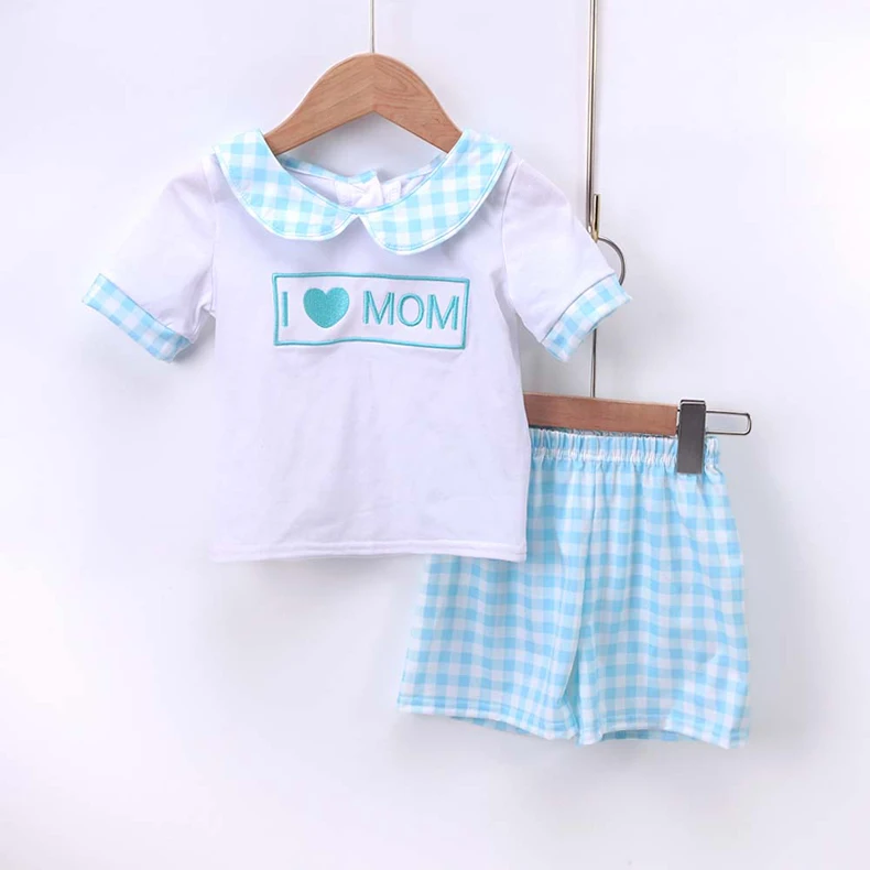 Женский костюм на день матери для мальчика, комплект из двух предметов с коротким рукавом и надписью «I Love Mom», синий топ с вышивкой и клетчатые шорты, костюмы