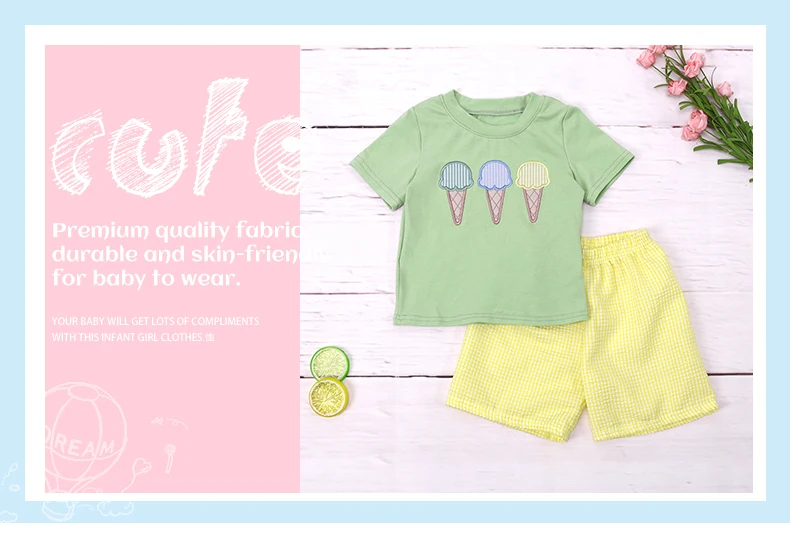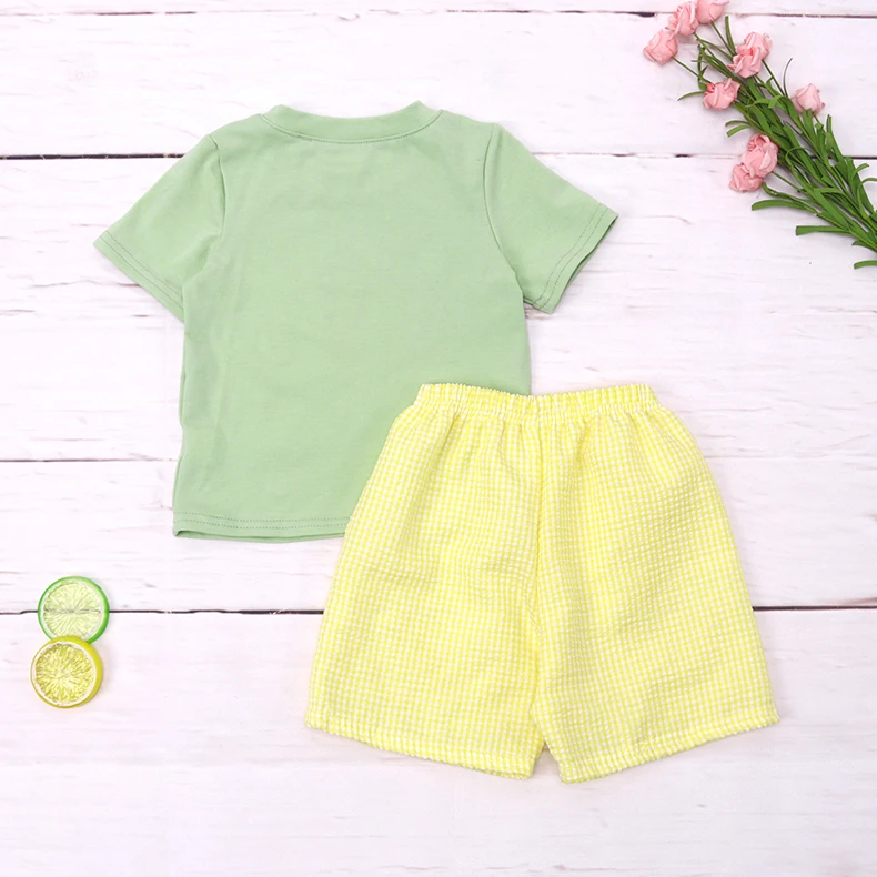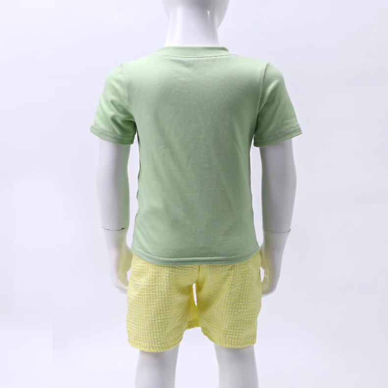От 1 до 8 лет Комплекты летних штанов для мальчиков зеленый топ желтые однотонные шорты 2 шт. Костюмы с рукавами до локтя с рисунком одежда для вышивки мороженого