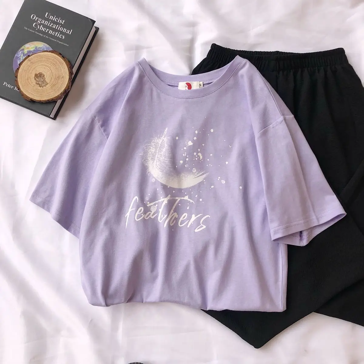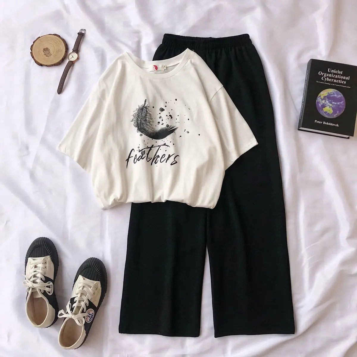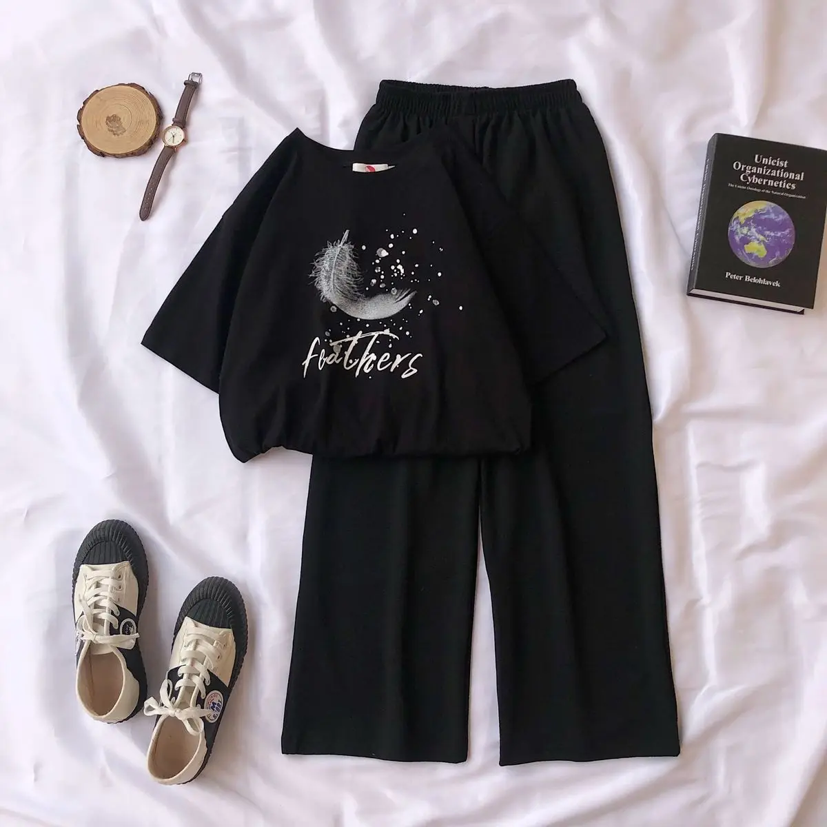 Женский летний костюм-двойка, футболка с коротким рукавом, корейский стиль, свободные широкие брюки, повседневный модный костюм-двойка, 2021