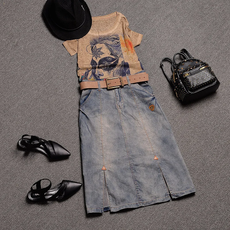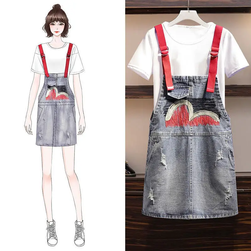Костюм с юбкой футболка для снижения возраста джинсовое платье с рваными подтяжками детский корейский свободный костюм летний женский костюм из двух предметов